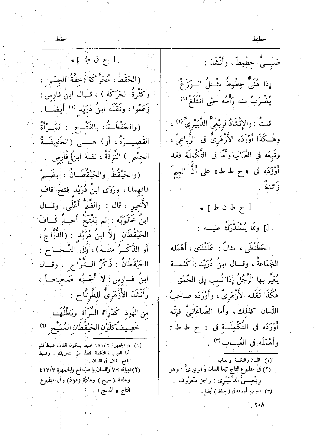 وممَّا يُسْتَدْرَكُ عَلَيْه: الحَطَنْطى، مثالُ: عَلَنْدى، أَهْمَلَهُ الْجَمَاعَة، وَقَالَ ابْن دُرَيْدٍ: كَلمة يُعَيَّر بهَا الرَّجُلُ إِذا نُسِبَ إِلَى الحُمْق. هَكَذا نَقَلَهُ الأّزْهَرِيّ، وأَوْرَدَه صَاحِبُ اللّسان كَذَلِك، وَأما الصَّاغَانِيُّ فإِنَّه أوْرَدَه فِي التَّكْمِلَة فِي ح ط ط