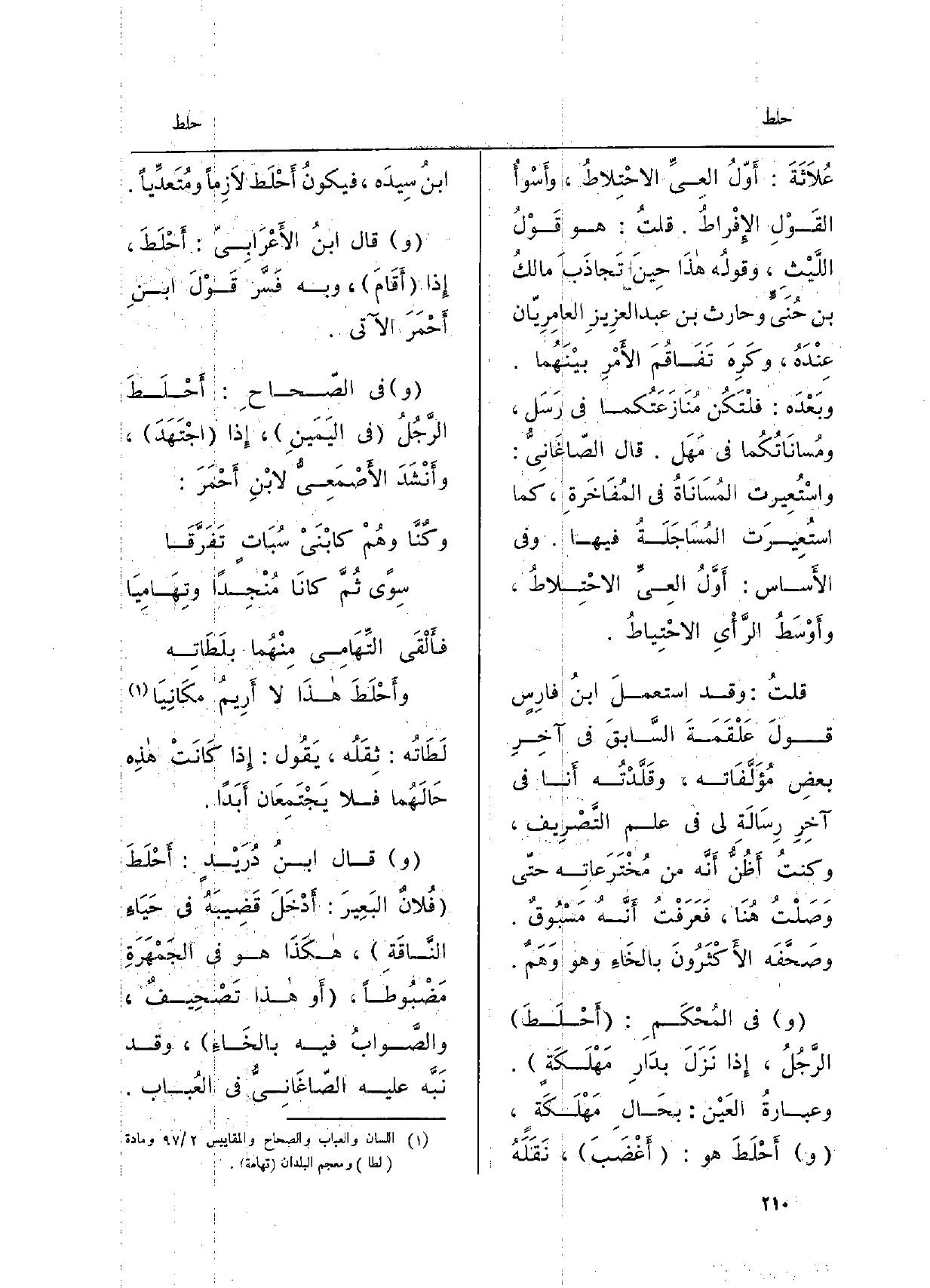 عُلاثَةَ: أَوّلُ العِيِّ الاحْتِلاطُ، وأَسْوأُ القولِ الإفْراطُ. قُلْتُ: هُوَ قَوْلُ اللَّيْثُ، وقولُه هَذَا حِين تَجاذَبَ مالكُ بن حُنَيٍّ وحارث بن عبد الْعَزِيز العامِرِيّان عِنْدَه، وكَرِهَ تَفاقُمَ الأمْرِ بَيْنَهُما. وبَعْدَه: فلْتَكُن مُنازَعَتُكما فِي رَسَل، ومُساناتُكُما فِي مَهَل. قالَ الصَّاغَانِيُّ: واسْتُعيرت المُساناةُ فِي المُفاخَرةِ، كَمَا استُعيرَت المُساجَلَةُ فِيهَا. وَفِي الأساس: أَوَّلُ العِيِّ الاحْتِلاطُ، وأَوْسَطُ الرَّأيِ الاحْتِياطُ. قُلْتُ: وَقَدْ استعملَ ابنُ فارسٍ قَوْلَ عَلْقَمَة السَّابقَ فِي آخرِ بعضِ مُؤَلَّفاته، وقَلَّدْتُه أَنا فِي آخِرِ رِسالةِ لي فِي علم التَّصْريف، وكنتُ أَظُنُّ أَنَّهُ من مُخْتَرَعاتِه حتَّى وَصَلْتُ هُنا، فَعَرَفْتُ أَنَّهُ مَسْبوقٌ. وصَحَّفَه الأَكْثَرونَ بالخاءِ وَهُوَ وَهَمٌ. وَفِي المُحْكَمِ: أَحْلَطَ الرَّجُلُ، إِذا نَزَلَ بدارِ مَهْلَكَةٍ. وعبارةُ العَيْن: بحالِ مَهْلَكَةٍ، وأَحْلَطَ هُوَ: أَغْضَبَ، نَقَلَهُ ابْن سيدَه، فَيكون أَحْلَطَ لازِماً ومُتَعَدِّياً. وَقَالَ ابْن الأَعْرَابِيّ: أَحْلَطَ، إِذا أَقامَ، وَبِه فَسَّر قَوْلَ ابْن أَحْمَرَ الْآتِي. وَفِي الصّحاح: أَحْلَطَ الرَّجُلُ فِي اليَمَينِ، إِذا اجْتَهَدَ، وأَنْشَدَ الأَصْمَعِيّ لِابْنِ أَحْمَرَ: