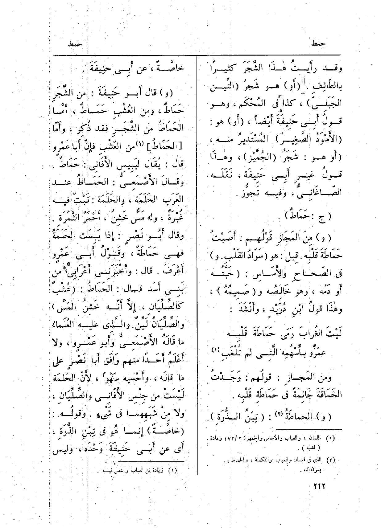 وَمن المَجَازِ: قولُهم: وَجَدْتُ الحَمَاقَةَ جاثِمَةً فِي حَمَاطَةِ قلبِه. والحَمَاطَةُ: تِبْنُ الذُّرَةِ خاصَّةً، عَن أَبي حَنِيفَةَ. وَقَالَ أَبو حَنِيفَةَ: من الشَّجرِ حَمَاطٌ، وَمن العُشْبِ حَمَاطٌ، أَمَّا الحَمَاطُ من الشَّجرِ فَقَدْ ذُكر، وأَمَّا الحَمَاطُ من العُشْبِ فإِنَّ أَبا عَمْرٍ وقالَ: يُقَالُ ليَبِيسِ الأَفَاني: حَمَاطٌ. وَقَالَ الأَصْمَعِيّ: الحَمَاطُ عِنْد العَرَب الحَلَمَة، والحَلَمَة: نبيٌ فِيهِ غَبْرَةٌ، وَله مَسٌّ خَشِنٌ، أَحمرُ الثَّمَرَةِ. وَقَالَ أَبو نَصْرٍ: إِذا يَبِسَت الحَلَمَةُ فَهِيَ حَمَاطَةٌ، وقولُ أَبي عَمْرٍ وأَعْرَفُ. قالَ: وأَخْبَرَني أَعْرابيٌّ من بَني أَسَد، قالَ: الحَمَاطُ: عشبٌ كالصِّلِّيَانِ، إلاَّ أَنَّهُ خَشِنُ المَسِّ، والصِّلِّيَانُ ليِّنٌ. وَالَّذِي عَلَيْهِ العُلَماءُ مَا قالَهُ الأَصْمَعِيّ وأَبو عَمْرٍ و، وَلَا أَعلَمُ أَحداً مِنْهُم وافَقَ أَبَا نَصْرٍ عَلَى مَا قالَهُ، وأَحْسَبه سَهْواً،)