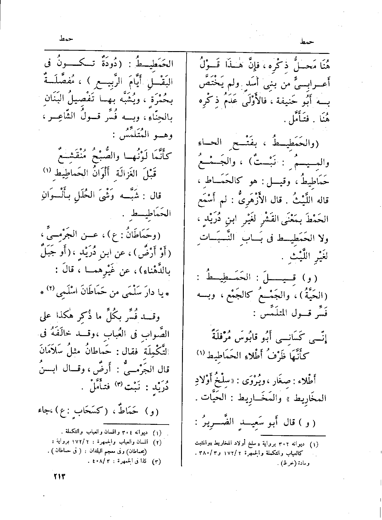 هُنا محلُّ ذِكْرِه، فإِنَّ هَذَا قَوْلُ أَعرابيٍّ من بَني أَسَدٍ وَلم يختصَّ بِهِ أَبو حَنِيفَةَ، فالأَوْلَى عدمُ ذِكْرِه هُنَا. فتأَمَّل. والحَمَطِيطُ، بفتْحِ الحاءِ والميمِ: نَبْتٌ، والجمعُ حَمَاطِيطٌ، وقِيل: هُوَ كالحَمَاطِ، قالَهُ اللَّيْثُ. وقالَ الأّزْهَرِيّ: لم أَسمع الحَمْطَ بمَعْنَى القَشْرِ لغيرِ ابنِ دُرَيْدٍ، وَلَا الحَمَطِيطُ فِي بابِ النَّبَاتِ لغَيْرِ اللَّيْثِ. وقِيل: الحَمَطِيطُ: الحيَّةُ، والجَمْعُ كالجَمْع، وَبِه فُسِّر قَوْلُ المتلَمِّس: