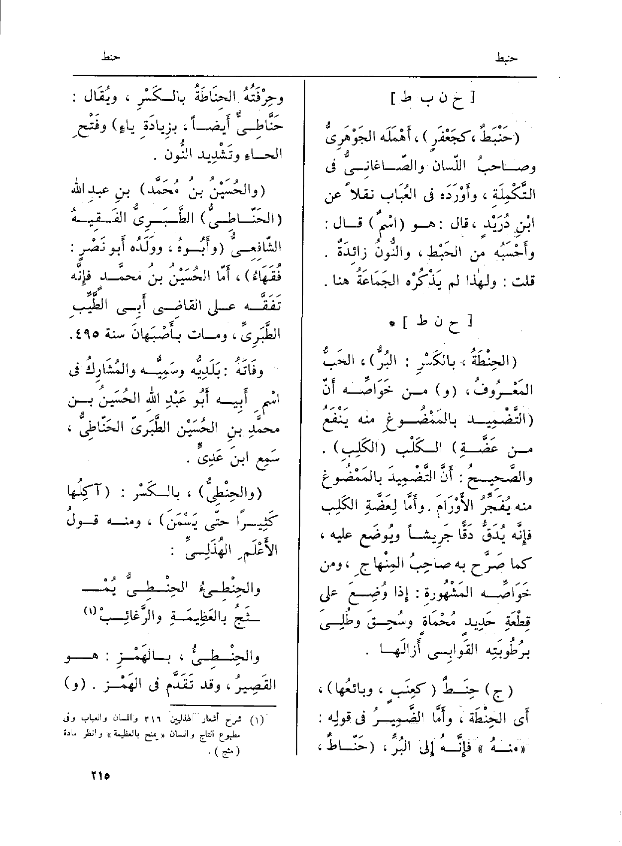 الحِنْطَةُ، بالكَسْرِ: البُرُّ، الحَبُّ المعروفُ، وَمن خَواصِّه أَنَّ التَّضْميد بالمَمْضُوغِ مِنْهُ ينفَعُ من عَضَّةِ الكَلْب الكَلِبِ. والصَّحيحُ: أَنَّ التَّضْميدَ بالمَمْضوغ مِنْهُ يُفَجِّرُ الأَوْرامَ. وأَمَّا لعَضَّةِ الكَلِبِ فإِنَّه يُدقُّ دَقًّا جَريشاً وُوضعُ عَلَيْهِ، كَمَا صرَّح بِهِ صاحِبُ المِنْهاجِ، وَمن خَواصِّه المشْهورَةِ، إِذا وُضِعَ على قِطْعَةٍ مُحْمَاةٍ وسُحِقَ وطُلِيَ برُطُوبَتِه القَوابِي أَزالَها. ج حِنَطٌ كعِنَبٍ، وبائعُها، أَي الحِنْطَة، وأَمَّا الضَّميرُ فِي قولِه: منهُ. فإِنَّه البُرِّ، حَنَّاطٌ، وحِرْفَتُه الحِنَاطَةُ بالكَسْرِ، ويُقَالُ: حَنَّاطِيٌّ أَيْضاً، بزِيادَةِ ياءٍ وفتْحِ الحاءِ وتَشْديدِ النُّون. والحُسَيْنُ بنُ محمَّد بنِ عَبْدِ اللهِ الحَنَّاطِيٌّ الطَّبَرِيُّ الفَقيهُ الشَّافعيُّ وأَبوه، وولَدُه أَبو نَصْرٍ: فُقَهاءُ، أَمَّا الحُسَينُ بنُ محمَّدٍ فإِنَّه تفَقَّه عَلَى القَاضِي أَبي الطَّيِّبِ الطَّبَرِيِّ، وَمَات بأَصْبَهانَ سنة. وفَاتَهُ: بَلَدِيُّهُ وسَمِيُّهُ والمُشاركُ فِي اسمِ أَبيه أَبُو عَبْدِ اللهِ الحسينُ بن محمَّدِ بنِ الْحُسَيْن الطَّبَرِيّ الحَنَّاطِيُّ، سمِعَ ابنَ عَدِيٍّ.
