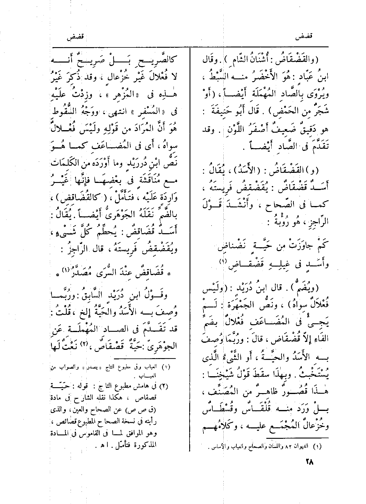 وأَنْشَدَ قَوْلُ الرَّاجِزِ، هُوَ رُؤْبَةُ: كَمْ جاوَزَتْ من حَيَّةٍ نَضْناضِ وأَسَدٍ فِي غِيلِهِ {قَضْقاضِ ويُضمُّ. قالَ ابنُ دُرَيْدٍ: وَلَيْسَ فُعْلالٌ سِواهُ، ونَصُّ الجَمْهَرَةِ: لم يَجِئْ فِي المُضاعَفِ فُعْلالٌ بضمِّ الفاءِ إلاَّ} قُضْقاض، قالَ: وربَّما وُصِفَ بِهِ الأَسَدُ والحيَّةُ، أَو الشَّيْءُ الَّذي يُسْتَخْبَثُ. وَبِهَذَا سقطَ قَوْلُ شيخِنا: هَذَا قُصورٌ ظاهِرٌ من المُصَنِّفِ، بَلْ وَرَدَ مِنْهُ قُلْقاسٌ وقُسْطاسٌ وخُزْعالٌ المُجْمَع عَلَيْهِ، وكلامُهم كالصَّريحِ بَلْ صَريحٌ أَنَّهُ لَا فُعْلالَ غير خُزْعالٍ، وَقَدْ ذُكر غيرُ هَذِه فِي المُزْهِر، وزِدتُ عَلَيْهِ فِي المُسْفِر، انْتَهَى. ووجهُ السُّقوطِ هُوَ أنَّ المُرادَ من قولِهِ وَلَيْسَ فُعْلالٌ سِواهُ، أَي فِي المُضاعَفِ كَمَا هُوَ نصُّ ابنُ دُرَيْدٍ وَمَا أَوْرَدَهُ من الكَلمات مَعَ مناقَشَةٍ فِي بعضِها فإِنَّها غيرُ وارِدَةٍ عَلَيْهِ، فتأَمَّلْ، {كالقُضاقِضِ، بالضَّمِّ نَقَلَهُ الجَوْهَرِيّ أَيْضاً. يُقَالُ: أَسَدٌ} قُضاقِضٌ: يُحطِّمُ فريسَتَهُ، قالَ الرَّاجِزُ: قُضَاقِضٌ عِنْدَ السُّرَى مُصَدَّرُ وقولُ ابنِ دُرَيْدٍ السَّابقُ: وربَّما وُصِفَ بِهِ الأسدُ والحيَّةُ إِلخ، قُلْتُ: قَدْ تَقَدَّم فِي الصَّادِ المهملةِ عنِ الجَوْهَرِيّ: حيَّةٌ قَصْقاصٌ، نَعْتٌ لَهَا