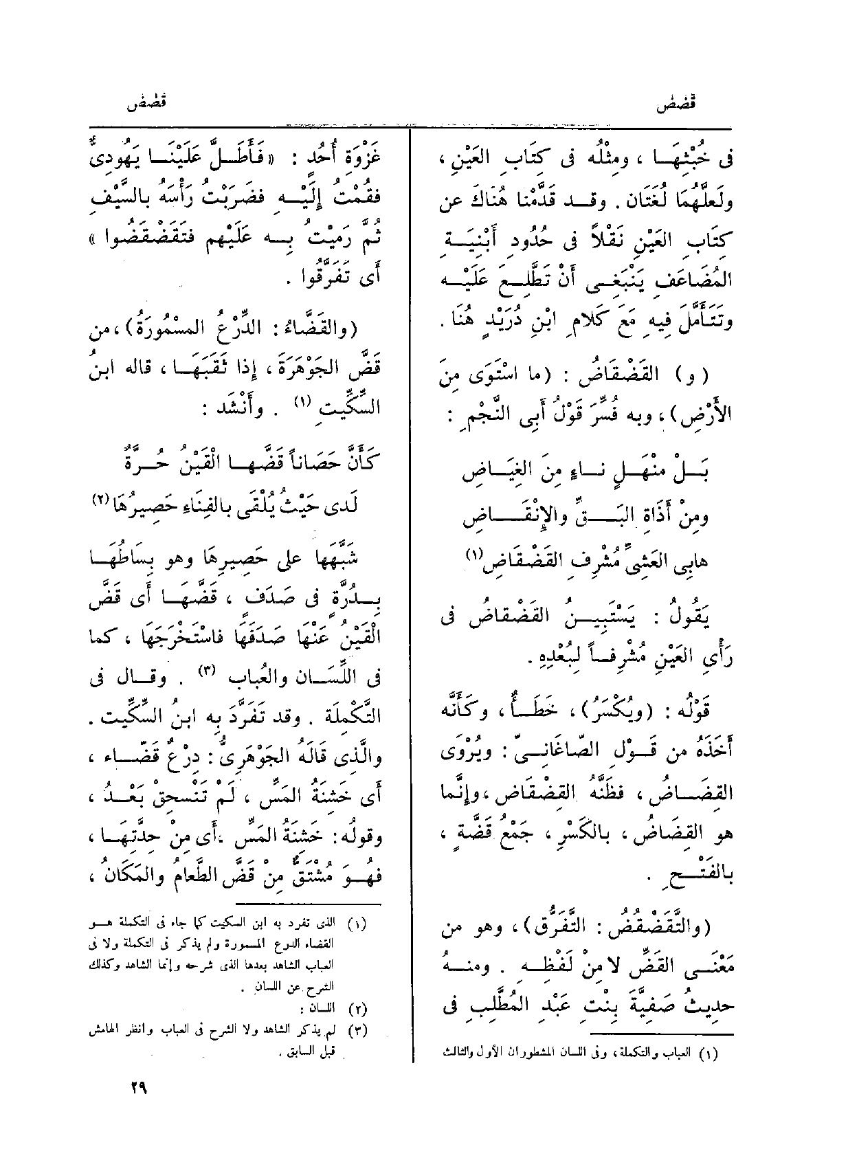 فِي خُبْثِها، وَمثله فِي كتابِ العَيْنِ، ولعلَّهُما لُغتان. وَقَدْ قَدَّمْنا هُناكَ عَن كتابِ العينِ نقلا فِي حُدودِ أَبْنِيَةِ المُضاعَفِ ينبَغي أنْ تَطَّلِعَ عَلَيْهِ وتَتَأَمَّلَ فِيهِ مَعَ كلامِ ابنِ دُرَيْدٍ هُنَا. و {القَضْقَاضُ: مَا استَوَى من الأَرضِ، وَبِه فُسِّرَ قَوْلُ أَبي النَّجمِ: بَلْ مَنْهَلٍ ناءٍ مِنَ الغِياضِ ومِنْ أَذَاةِ البَقِّ والإِنْقَاضِ هابِي العَشِيِّ مُشْرِفِ القَضْقَاضِ يَقُولُ: يَسْتَبينُ القَضْقَاضُ فِي رَأْيِ العينِ مُشْرِفاً لبُعْدِهِ. قولُه: ويُكسَرُ، خَطَأٌ، وكَأَنَّهُ أَخَذَهُ من قَوْل الصَّاغَانِيُّ: ويُروى} القِضاضُ، فظنَّهُ القِضْقاضُ، وإِنَّما هُوَ {القِضاضُ، بالكَسْرِ، جمعُ قَضَّةٍ، بالفَتْحِ.} والتَّقَضْقُضُ: التَّفَرُّقُ، وَهُوَ من معنى {القَضِّ لَا من لفظِهِ. ومِنْهُ حديثُ صَفِيَّةَ بنتِ عبد المُطَّلِب فِي غَزْوَةِ أُحُدٍ: فأَطَلَّ عليْنَا يَهودِيٌّ فقُمْتُ إِلَيْه فَضَرَبْتُ رأْسَهُ بالسَّيْفِ ثمَّ رَمَيْتُ بِهِ علَيْهم} فَتَقَضْقَضُوا أَي تَفَرَّقوا. {والقَضَّاءُ: الدِّرْعُ المسْمورَةُ، من} قَضَّ الجوهَرَةَ، إِذا ثَقَبَها، قَالَه ابنُ السِّكِّيتِ. وأَنْشَدَ:)
