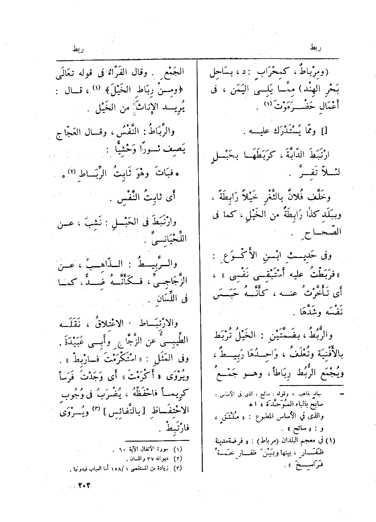وممَّا يُسْتَدْرَكُ عَلَيْه: ارْتَبَطَ الدَّابَّةَ، كرَبَطَها بحَبْلٍ لئلاّ تَفِرَّ. وخَلَّفَ فلانٌ بالثَّغْرِ خَيْلاً رابِطَةً، وببَلَدِ كَذَا رَابِطَةٌ من الخَيْلِ، كَمَا فِي الصّحاح. وَفِي حَديثِ ابنِ الأَكْوَعِ: فرَبَطْتُ عَلَيْهِ أَسْتَبْقي نَفْسِي، أَي تأَخَّرْتُ عَنهُ، كَأَنَّهُ حَبَسَ نفسَه وشدَّها. والرُّبُطُ، بضَمَّتَيْنِ: الخَيْلُ تُرْبَط بالأَفْنِية وتُعلَفُ، واحِدُها رَبِيطٌ، ويُجمعُ الرُّبُط رِبَاطاً، وَهُوَ جمعُ الجَمْعِ. وقالَ الفَرَّاءُ فِي قَوْله تَعَالَى ومِنْ رِباطِ الخَيْلَ، قالَ: يُريدُ الإِناثَ من الخَيْل. والرِّبَاطُ: النَّفْسُ، وقالَ العجَّاج يَصِفُ ثَوْراً وَحْشِيًّا: فبَاتَ وَهُوَ ثابِتُ الرِّبَاطِ أَي ثابِتُ النَّفْسِ. وارْتَبَطَ فِي الحَبْلِ: نَشِبَ، عَن اللِّحْيانِيّ. والرَّبِيطُ: الذَّاهبُ، عَن الزَّجاجِيِّ، فكأَنَّه ضِدٌّ، كَمَا فِي اللّسَان. والارْتِباطُ: الاعْتِلاقُ، نَقَلَهُ الطِّيبِيُّ عَن الزَّجَّاجِ وأَبي عُبَيْدَة. وَفِي المَثَل: اسْتَكْرَمْتَ فارْبِطْ ويُرْوَى: أَكْرَمْتَ. أَي وَجَدْتَ فَرَساً كَرِيمًا فاحْفَظْه، يُضْرَبُ فِي وُجوبِ الاحْتِفاظِ بالنَّفائِسِ، ويُرْوَى فارْتَبِط.