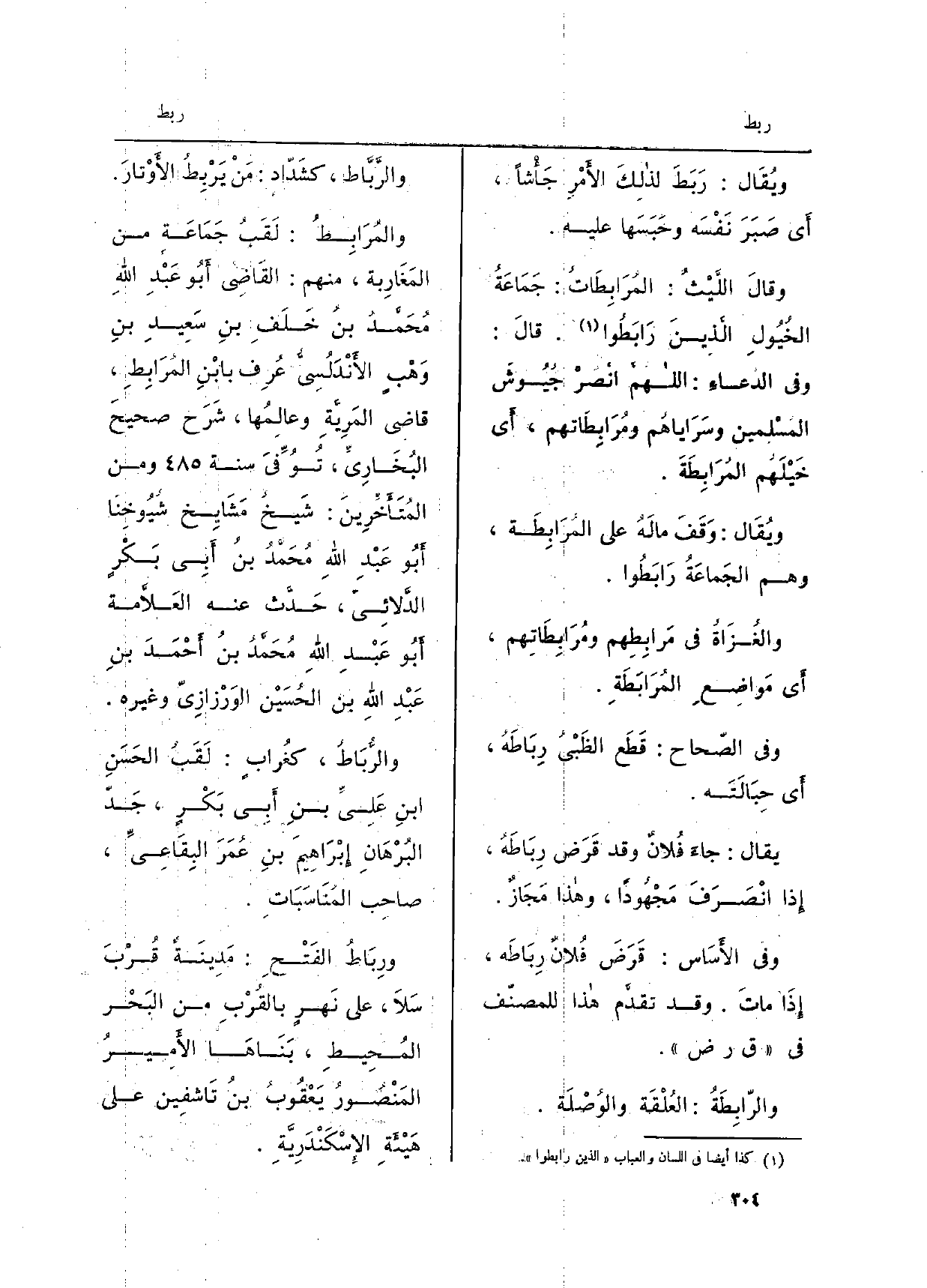 ويُقَالُ: رَبَطَ لذَلِك الأَمْرِ جَأْشاً، أَي صَبَرَ نَفْسَه وحَبَسَها عَلَيْهِ. وقالَ اللَّيْثُ: المُرابِطاتُ: جماعَةُ الخُيُولِ الَّذينَ رَابَطوا. قالَ: وَفِي الدُّعاءِ: اللهمَّ انْصُرْ جُيُوشَ المسْلِمين وسَرَايَاهُم ومُرَابِطاتُهم، أَي خَيْلَهم المُرابِطَة. ويُقَالُ: وَقَفَ مالَهُ عَلَى المُرابَطَةِ، وهم الجِماعَةُ رَابَطُوا. والغُزاةُ فِي مَرَابِطهم ومُرَابَطاتِهم، أَي مواضعُ المُرابَطَةِ.