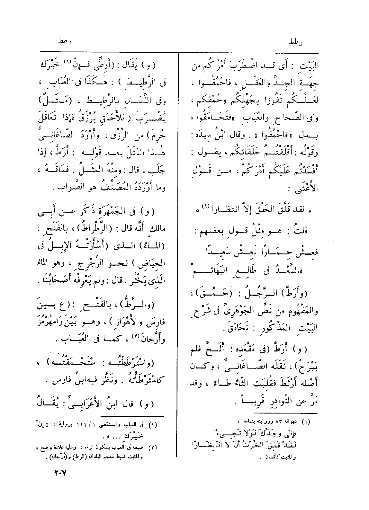 {وأَرَطَّ الرَّجُلُ: حَمُقَ، والمَفْهومُ من نصِّ الجَوْهَرِيّ فِي شرحِ البيتِ المَذْكورِ: تَحَامَقَ. وأَرَطَّ فِي مَقْعَدِه: أَلَحَّ فَلم يَبْرَحْ، نَقَلَهُ الصَّاغَانِيّ، وَكَانَ أَصلُه أَرْثَطَ فقُلِبَت الثَّاءُ طاءً، وَقَدْ مرَّ عَن النَّوادِرِ قَريباً. ويُقَالُ:} - أَرِطِّي فإِنَّ خَيْرَك فِي {الرَّطِيطِ: هَكَذا فِي العُبَاب، وَفِي اللّسَان} بالرَّطيطِ، مَثَلٌ يُضْرِبُ للأَحْمَقِ يُرزَقُ فَإِذا تَعَاقَلَ حُرِمَ من الرِّزق، وأَوْرَدَ الصَّاغَانِيّ هَذَا المَثَل بعد قولِه: {أَرَطَّ، إِذا جَلَب، قالَ: ومِنْهُ المثَلُ. فساقَهُ، وَمَا أَوْرَدَهُ المُصَنِّف هُوَ الصَّوَابُ. وَفِي الجَمْهَرَة ذَكَر عَن أَبي مالكٍ أَنَّهُ قالَ:} الرَّطْراطُ، بالفَتْحِ: الماءُ الَّذي أَسْأَرَتْهُ الإِبِلُ فِي الحِياضِ نَحْو الرِّجْرِجِ، وَهُوَ الماءُ الَّذي يَخْثُر، قالَ: وَلم يَعْرِفْه أَصْحابُنا. {والرَّطُّ، بالفَتْحِ: ع بَيْنَ فارِسٍ والأَهْوازِ، وَهُوَ بَيْنَ رَامهُرْمُزَ وأَرَّجانَ، كَمَا فِي العُبَاب.} واسْتَرْطَطْتُه: اسْتَحْمَقْتُه،! كاسْتَرْطَأْتُه. ونَظَّر فِيهِ ابنُ فَارس. وقالَ ابْن الأَعْرَابِيّ: يُقَالُ