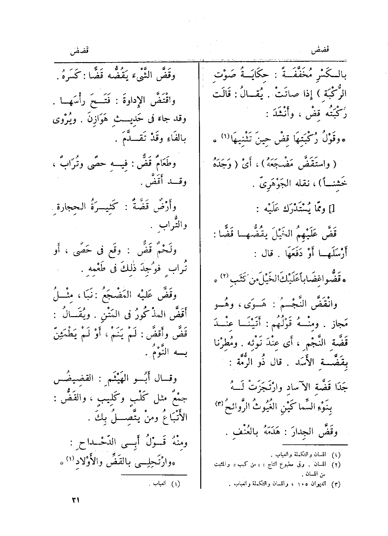 بالكَسْرمخفَّفةً: حكايَةُ صوتِ الرُّكْبَةِ إِذا صاتَتْ. يُقَالُ: قالتْ رُكْبَتُه {قِضْ، وأَنْشَدَ: وقَوْلُ رُكْبَتِها قِضْ حينَ تَثْنِيها} واستَقَضَّ مضجَعَهُ، أَي وجَدَهُ خَشِناً، نَقَلَهُ الجَوْهَرِيّ. وممَّا يُسْتَدْرَكُ عَلَيْه: {قَضَّ عليهمُ الخيلُ} يقُضُّها {قَضًّا: أَرْسَلَها أَو دَفَعَها. قالَ: قَضُّوا غِضاباً عَلَيْكَ الخَيْلَ من كَثَبِ} وانْقَضَّ النَّجمُ: هوَى، وَهُوَ مَجاز. ومِنْهُ قولُهُم: أَتَيْنا عِنْد {قَضَّةِ النَّجمِ، أَي عِنْد نَوْئِه. ومُطِرْنا)