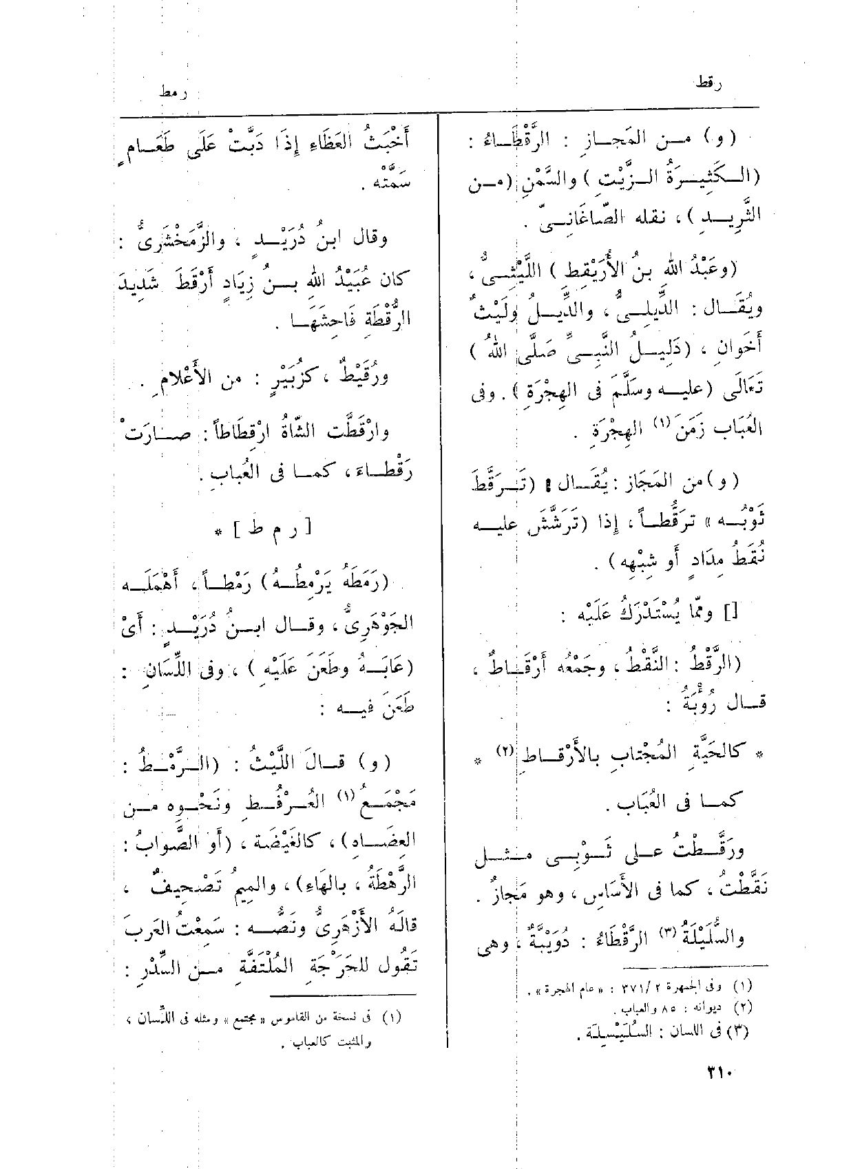 وَمن المَجَازِ: الرَّقْطاءُ: الكَثيرةُ الزَّيْتِ والسَّمْنِ من الثَّريدِ، نَقَلَهُ الصَّاغَانِيّ. وَعبد الله بنُ الأُرَيْقِطِ اللَّيْثِيُّ،)
