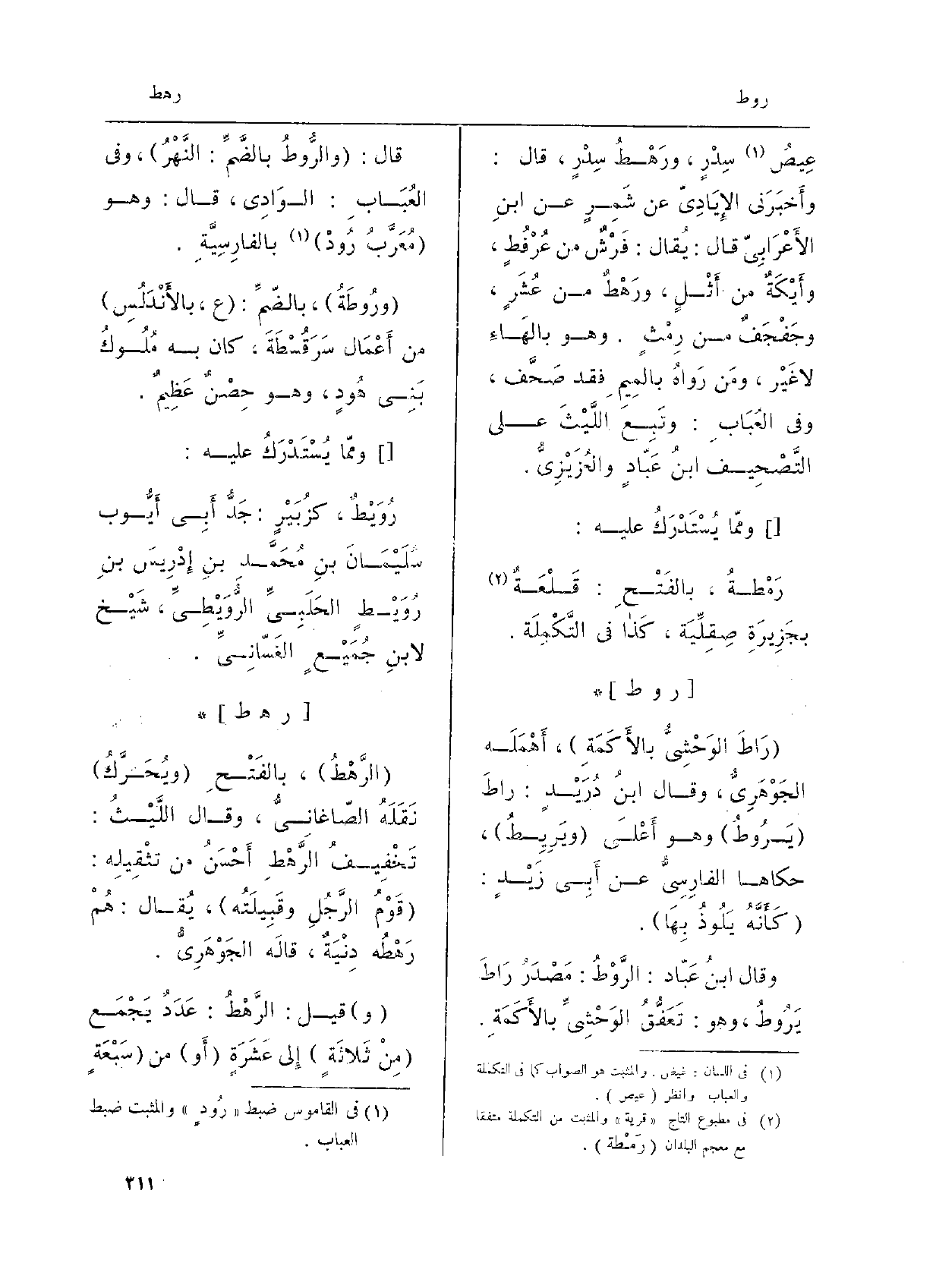 {راطَ الوَحْشِيُّ بالأَكَمَةِ، أَهْمَلَهُ الجَوْهَرِيّ، وقالَ ابْن دُرَيْدٍ: راطَ} يَروطُ وَهُوَ أَعْلى {ويَريطُ، حَكَاهَا الفارِسيُّ عَن أبي زَيدٍ: كَأَنَّهُ يَلوذُ بهَا. وقالَ ابْن عَبّادٍ:} الرَّوْطُ: مَصْدَرُ {راطَ} يَرُوطُ، وَهُوَ: تَعَفُّقُ الوَحْشِيِّ بالأَكَمَةِ. قالَ: {والرُّوطُ بالضَّمِّ: النَّهْرُ، وَفِي العُبَاب: الْوَادي، قالَ: وَهُوَ مُعَرَّبُ رودْ بالفارِسِيَّة.} ورُوطَةُ، بالضَّمِّ: ع، بالأَنْدَلُس من أَعْمال سَرَقُسْطَةَ، كانَ بِهِ مُلوكُ بَني هودٍ، وَهُوَ حِصْنٌ عَظيمٌ. وممَّا يُسْتَدْرَكُ عَلَيْه: {رُوَيْطٌ، كزُبَيْرٌ: جَدُّ أَبي أَيُّوب سُلَيْمانُ بن محمَّدِ بنِ إِدْريسَ بنِ رُوَيْطٍ الحَلَبِيِّ} - الرُّوَيْطِيِّ، شَيْخ لابنِ جُمَيْعٍ الغَسَّانِيِّ.