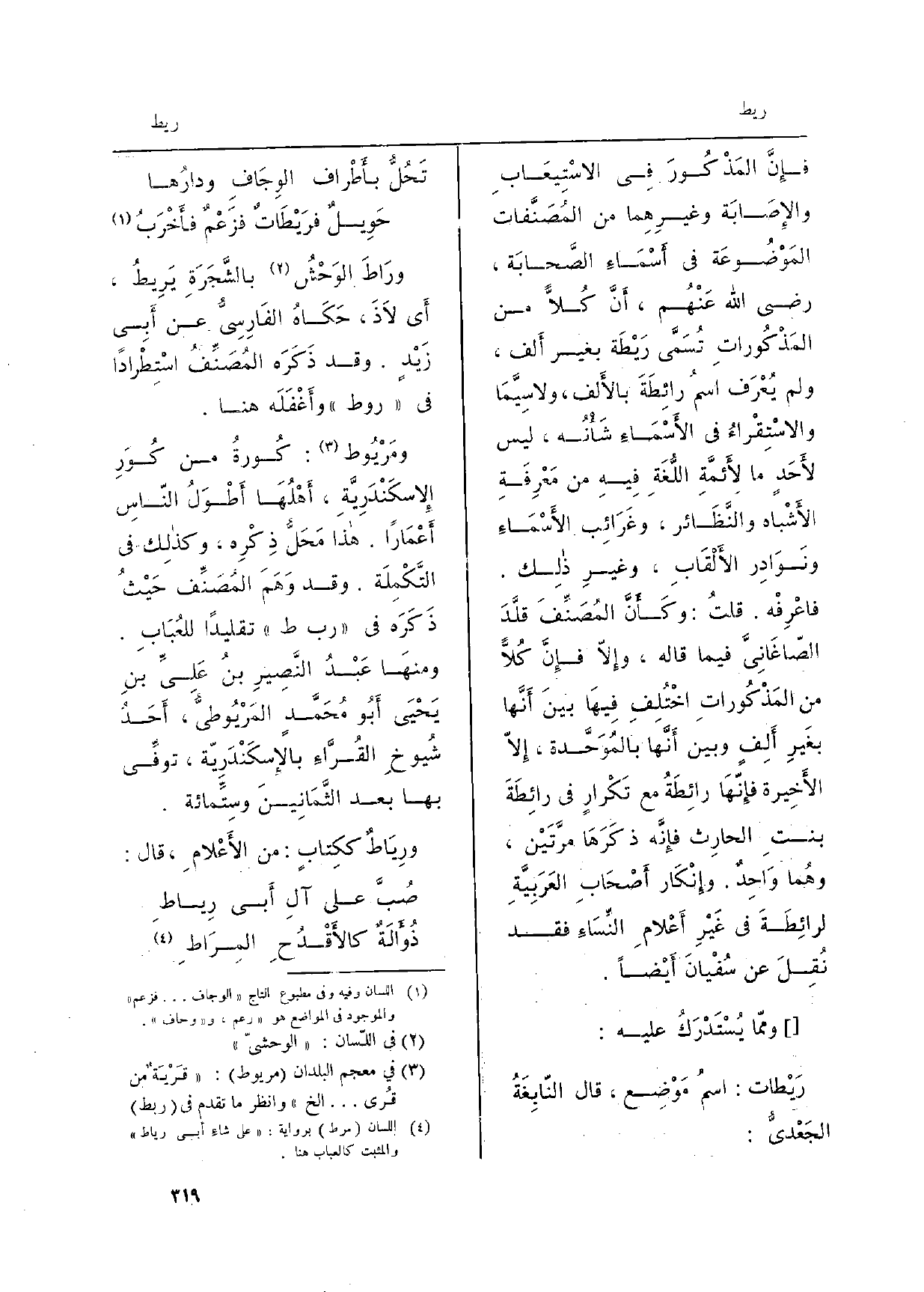فإِنَّ المَذْكورَ فِي الاسْتِيعابِ والإِصابَةِ وغيرِهِما من المُصَنَّفات المَوْضُوعَةُ فِي أَسْماءِ الصَّحابَة، رَضِيَ الله عَنْهم، أَنَّ كُلاًّ من المَذْكُوراتِ تُسَمَّى رَيْطَة بغيرِ أَلف، وَلم يُعرف اسمُ رَائِطَةَ بِالْألف، وَلَا سِيَّما والاسْتِقْراءُ فِي الأَسماءِ شَأْنُه، لَيْسَ لأَحَدٍ مَا لأُئمَّةِ اللُّغَةِ من معرِفَةِ الأَشْباه والنَّظائِر، وغَرائِب الأَسماءِ ونَوَادِرِ الأَلْقاب، وغيرِ ذلِكَ. فاعْرِفْه. قُلْتُ: وكأَنَّ المُصَنِّف قلَّدَ الصَّاغَانِيّ فِيمَا قالَهُ، وإِلاّ فإِنَّ كُلاًّ من المَذْكوراتِ اخْتُلِفَ فِيهَا بَيْنَ أَنَّها بغَيرِ أَلِفٍ وبينَ أَنَّها بالمُوَحَّدَة، إلاَّ الأَخير فإِنَّها رَائِطَةُ مَعَ تَكْرارٍ فِي رَائِطَةَ بنتِ الحارِث فإِنَّه ذَكَرَها مرَّتَيْن، وهُما واحِدٌ. وإِنْكارُ أَصْحابِ العَرَبِيَّةِ {لرَائِطَةَ فِي غيرِ أَعْلامِ النِّسَاءِ فَقَدْ نُقِلَ عَن سُفْيَانَ أَيْضاً. وممَّا يُسْتَدْرَكُ عَلَيْه:} رَيْطات: اسْم مَوْضِع، قالَ النَّابِغَة الجَعْدِيُّ: