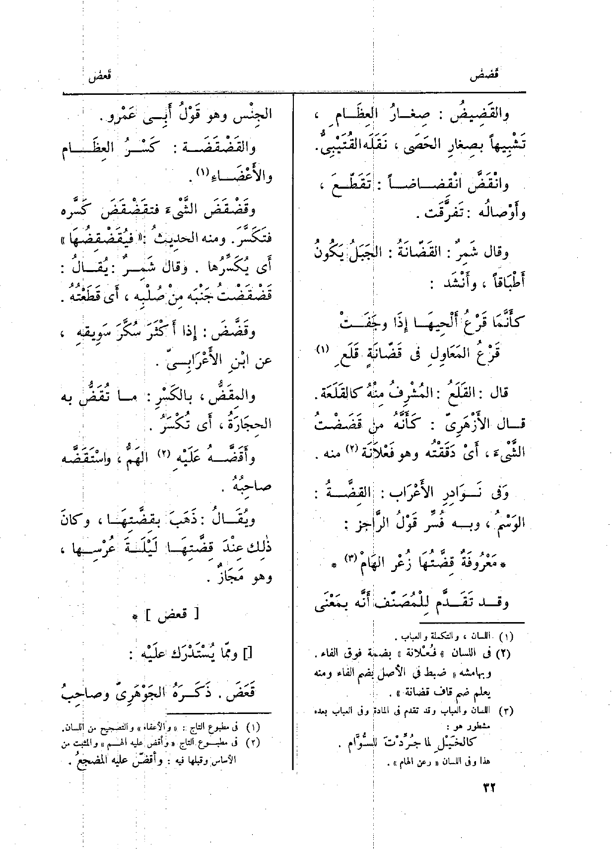 قالَ: القَلَعُ: المشرفُ مِنْهُ كالقَلْعَة. قالَ الأّزْهَرِيّ: كَأَنَّهُ من} قَضَضْتُ الشَّيْءَ، أَي دققتُه وَهُوَ فَعْلانَة مِنْهُ. وَفِي نَوادِرِ الأَعْراب: {القِضَّةُ: الوَسْمُ، وَبِه فُسِّر قَوْلُ الرَّاجِز: مَعْروفَةٌ} قِضَّتُهَا زُعْر الهَامْ وَقَدْ تَقَدَّم للمصنِّف أَنَّهُ بمَعْنَى الجِنْس، وَهُوَ قَوْلُ أَبي عَمْرو. {والقَضْقَضَةُ: كسرُ العِظام والأَعضاءِ.} وقَضْقَضَ الشيءَ {فتَقَضْقَضَ: كسَّره فتكسَّرَ. ومِنْهُ الحَدِيث:} فيُقَضْقِضُهَا أَي يُكسِّرُها. وَقَالَ شمرٌ: يُقَالُ: {قَضْقَضْتُ جَنْبَهُ مِنْ صُلْبِه، أَي قطعتُهُ.} وقَضَّضَ: إِذا أَكثرَ سُكَّرَ سَوِيقهِ، عَن ابنُ الأَعْرَابيّ. {والمِقَضُّ، بالكَسْرِ: مَا} تُقَضُّ بِهِ الحجارَةُ، أَي تُكْسَرُ. {وأَقَضَّهُ عَلَيْهِ الهَمُّ،} واسْتَقَضَّه صاحبُهُ. ويُقَالُ: ذهبَ {بقِضَّتِهَا، وَكَانَ ذَلِك عندَ} قِضَّتِهَا ليلَةَ عُرْسِها، وَهُوَ مَجازٌ.