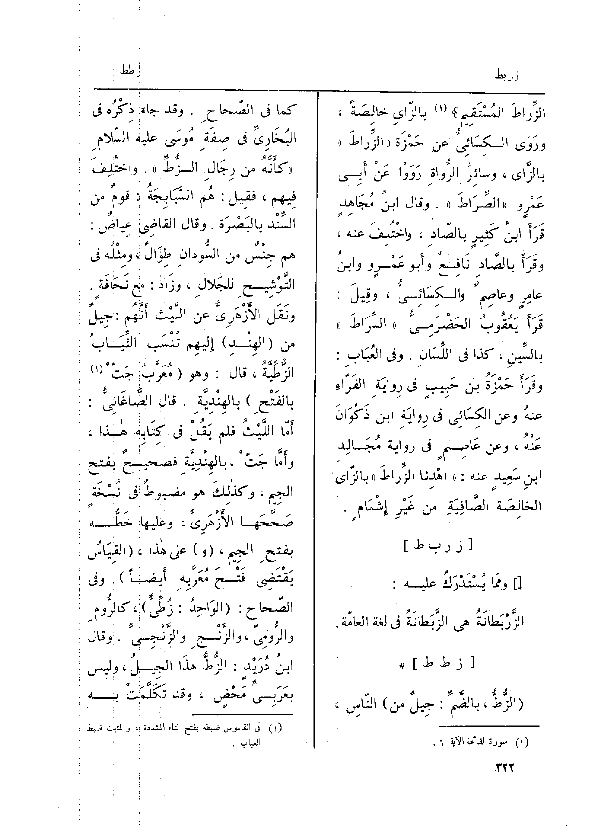الزِّراطَ المُسْتَقيم بالزَّاي خالِصَةً، وروَى الكِسَائِيّ عَن حمْزَة: الزِّراطَ: بالزَّاي، وسائرُ الرُّواةِ رَوَوْا عَن أَبي عَمْرٍ و: الصِّرَاطَ.
