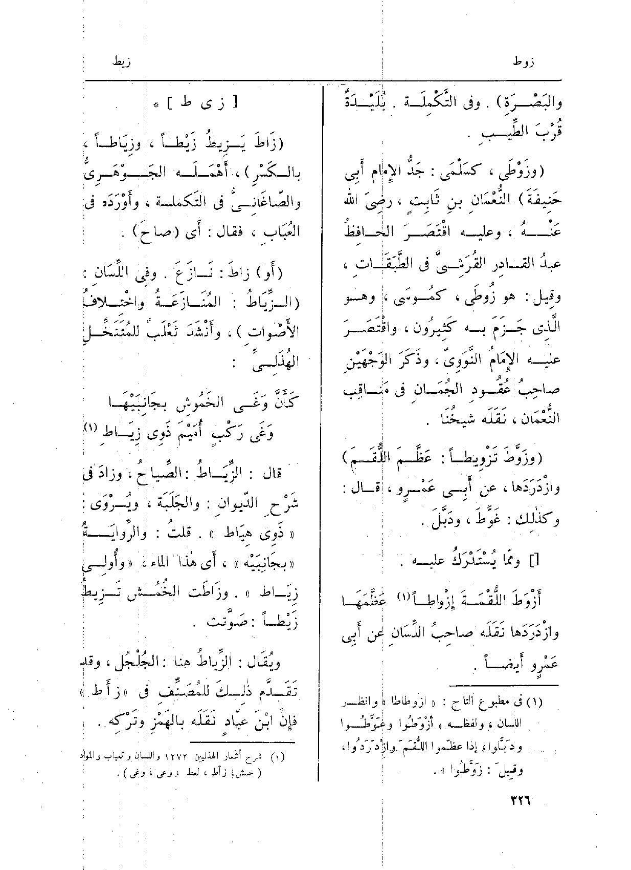 والبَصْرَةِ. وَفِي التَّكْمِلَة. بُلَيْدَةٌ قُرْبَ الطِّيبِ. {وزَوْطَى، كسَلْمَى: جَدُّ الإِمَام أَبي حَنيفَة النُّعْمان بن ثابِتٍ، رَضِيَ الله عَنْه، وَعَلِيهِ اقْتَصَرَ الحافِظُ عبد الْقَادِر القُرَشِيُّ فِي الطَّبَقاتِ، وقِيل: هُوَ} زُوطَى، كموسَى، وَهُوَ الَّذي جَزَمَ بِهِ كَثيرون، واقْتَصَرَ عَلَيْهِ الإِمَام النَّوَويّ، وذَكَرَ الوَجْهَيْنِ صَاحِب عُقودِ الجُمانِ فِي مَناقب النُّعْمان، نَقَلَهُ شيخُنا. {وزَوَّطَ} تَزْويطاً: عَظَّمَ اللُّقَمَ وازْدَرَدَها، عَن أَبي عَمْرٍ و، قالَ: وكَذلِكَ: غَوَّطَ، ودَبَّلَ. وممَّا يُسْتَدْرَكُ عَلَيْه {أَزْوَطَ اللُّقْمَةَ} إزْواطاً عَظَّمَها وازْدَرَدَها نَقَلَهُ صَاحِب اللِّسان عَن أَبي عَمْرٍ وأَيْضاً.