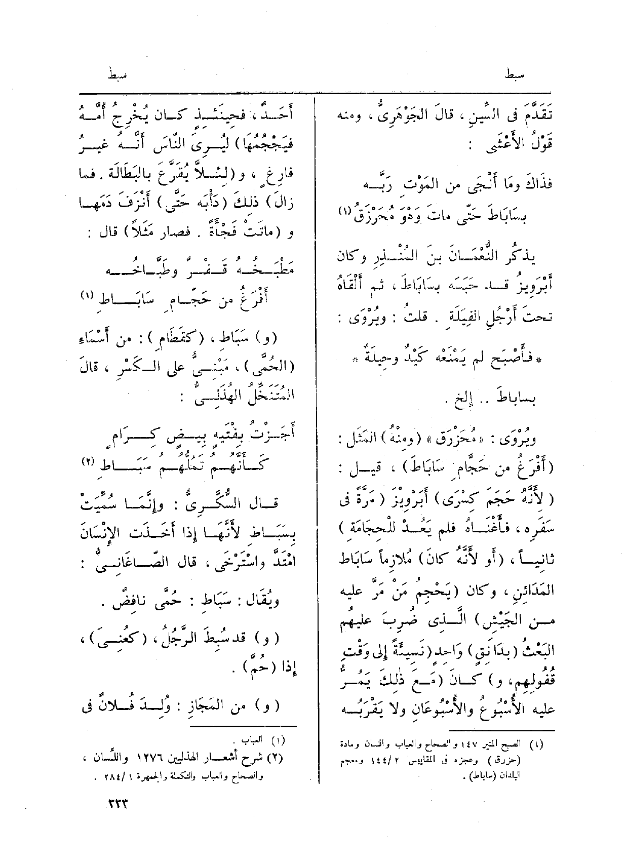 وسَباطِ، كقَطامِ: من أَسْماءِ الحُمَّى، مَبْنِيُّ عَلَى الكسْرِ، قالَ المُتَنَخِّلُ الهُذَلِيّ: