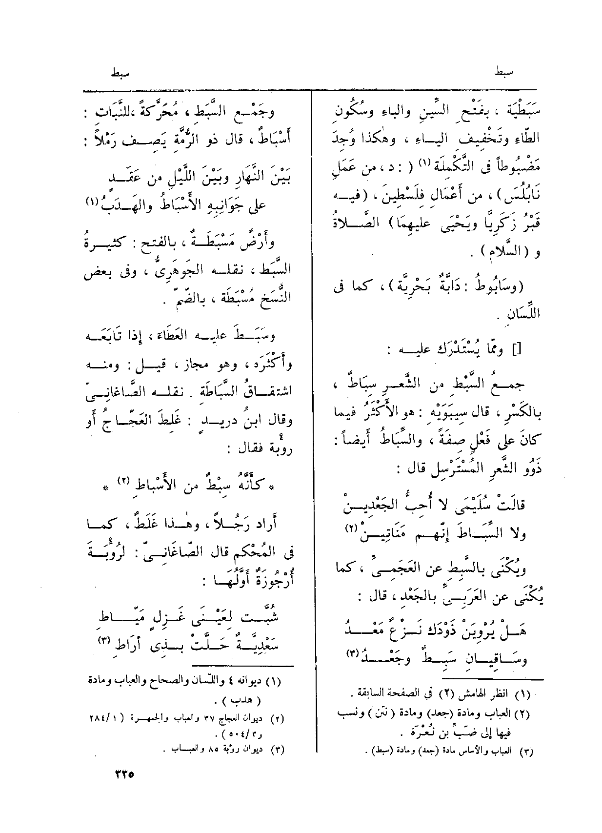وَهَكَذَا وُجِدَ مَضْبوطاً فِي التَّكْمِلَة: د، من عَمَلِ نابُلُسَ، من أَعْمالِ فِلَسْطين، فِيهِ قَبْرُ زَكريَّا ويَحْيَى عَلَيْهِمَا الصَّلاة والسَّلام. وسابوطُ: دابَّةٌ بَحْرِيَّة، كَمَا فِي اللِّسان. وممَّا يُسْتَدْرَكُ عَلَيْه: جمعُ السَّبْطِ من الشَّعْرِ سِباطٌ، بالكَسْرِ، قالَ سِيبَوَيْه: هُوَ الأكْثَرُ فِيمَا كانَ عَلَى فَعْلٍ صِفَةٍ، والسِّباطُ أَيْضاً: ذَوو الشَّعرِ المُسْتَرْسِل قالَ: قالَت سُلَيْمَى لَا أُحِبُّ الجَعْدينْ وَلَا السِّباطَ إنّهم مَناتِينْ ويُكْنَى بالسَّبِطِ عَن العَجَميِّ، كَمَا يُكْنَى عَن العَرَبِيِّ بالجَعْدِ، قالَ: هَلْ يُرْوِيَنْ ذَوْدَك نَزْعٌ مَعْدُ وساقيانِ سَبِطٌ وجَعْدُ وجَمع السَّبَطِ، مُحَرَّكَةً، للنَّباتِ: أَسْباطٌ، قالَ ذُو الرُّمَّة يَصِف رَمْلاً: