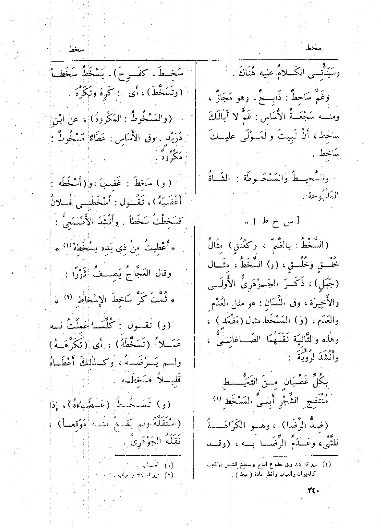 السُّخْطُ، بالضَّمِّ، كعُنُقٍ مثالُ خُلْقٍ وخُلُقٍ، والسَّخَطُ، مثالُ جَبَلٍ، ذَكَرَ الجَوْهَرِيّ الأُولى والأخيرة، وَفِي اللِّسان: هُوَ مِثْلُ العُدْمِ والعَدَم، والمَسْخَط مِثَال مَقْعَدٍ، وَهَذِه والثَّانية نَقَلَهُما الصَّاغَانِيّ، وأَنْشَدَ لرُؤْبَة: بكُلِّ غَضْبانٍ منَ التَعَيُّطِ مُنْتَفِجِ الشَّجْرِ أَبِيِّ المَسْخَطِ ضِدُّ الرِّضا، وَهُوَ الكَراهَةُ للشَّيْءِ وعَدَمُ الرِّضا بِهِ، وَقَدْ سَخِطَ، كفَرِحَ، يَسْخَطُ سَخَطاً وتَسَخَّطَ، أَي: كَرِهَ وتَكَرَّهَ. والمَسْخوطُ: المَكْروهُ، عَن ابْن دُرَيْدٍ: وَفِي الأَسَاسِ: عَطاءٌ مَسْخوطٌ: مَكْروهٌ.