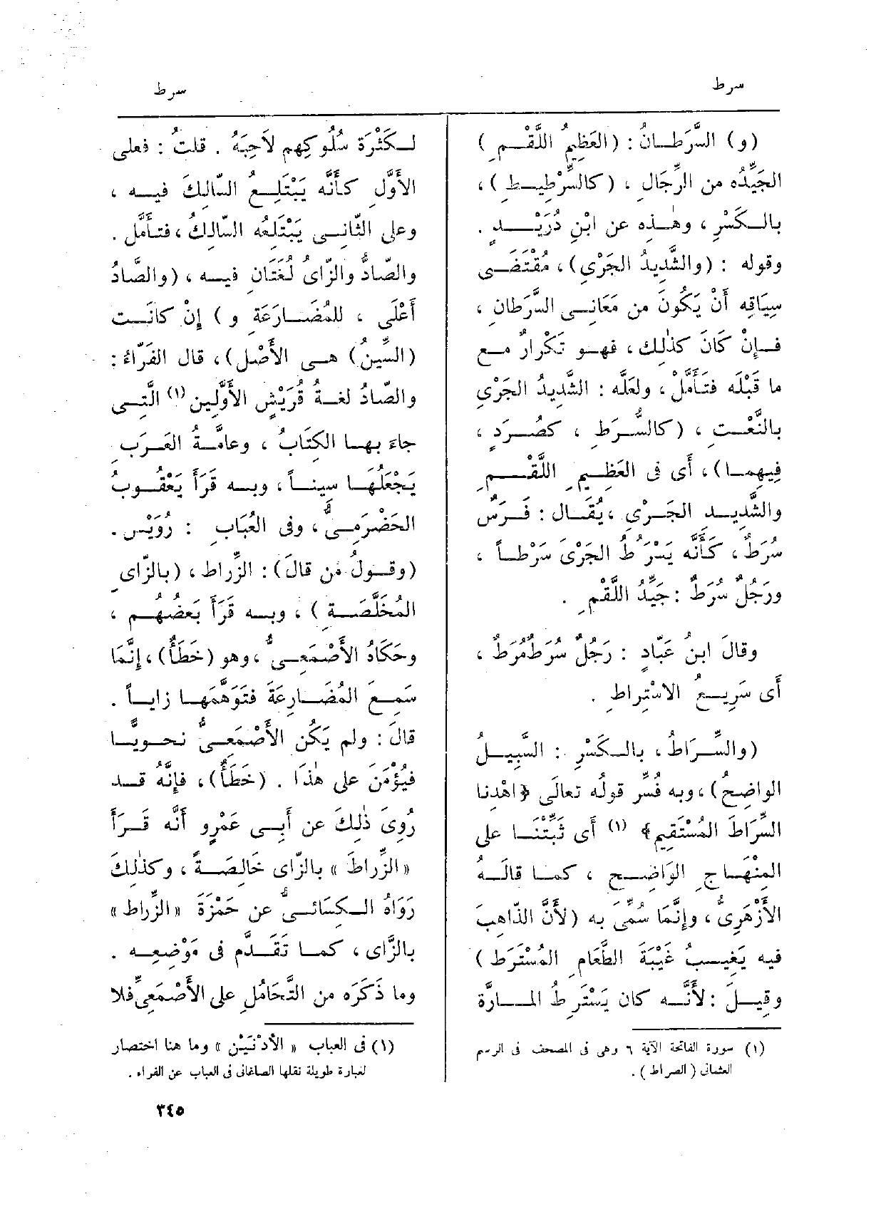 والصَّادُ والزَّاي لُغَتانِ فِيهِ، والصَّادُ أَعْلى، للمُضارَعَة وإِنْ كَانَت السِّينُ هِيَ الأَصلُ، قالَ الفَرَّاءُ: والصَّادُ لغةُ قريشٍ الأَوَّلين الَّتِي جَاءَ بهَا الكتابُ، وعامَّةُ العَرَبِ يَجْعَلُها سيناً، وَبِه قَرأَ يَعْقوبُ الحَضْرَميُّ، وَفِي العُبَاب: رُوَيْس. وقولُ من قالَ: الزِّراط، بالزَّاي المُخَلَّصَةِ، وَبِه قَرأَ بعضُهم، وحَكاه الأَصْمَعِيّ، وَهُوَ خَطَأٌ، إنَّما سَمِعَ المُضارعَةَ فتوَهَّمَها زاياً. قالَ: وَلم يكنْ الأَصْمَعِيّ نحويًّا فيُؤْمَنُ عَلَى هَذَا. خَطَأٌ، فإِنَّه قَدْ رُوِيَ ذلِكَ عَن أَبي عَمْرو أَنَّهُ قَرَأَ الزِّراط بالزَّاي خالِصَةً، وكَذلِكَ رَواهُ الكِسَائِيّ عَن حمْزَةَ الزِّراط بالزَّاي، كَمَا تَقَدَّم فِي موضِعِه. وَمَا) ذَكَرَهُ من التَّحامُلِ عَلَى الأَصْمَعِيّ فَلَا