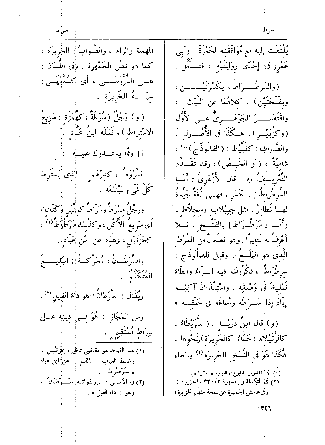 يُلتَفَتُ إِلَيْه مَعَ مُوافَقَتِه لحَمْزَةَ. وأَبي عمرٍ وَفِي إِحْدى رِوايَتَيْه، فتأَمَّلْ. والسّرطْرَاطُ، بكسرَتَيْن وبفَتْحَتَيْنِ، كِلَاهُمَا عَن اللَّيْثِ، واقْتَصَرَ الجَوْهَرِيّ عَلَى الأَوَّل وكزُبَيْرٍ، هَكَذا فِي الأُصولِ، والصَّوَابُ: كقُبَّيْط، الفالُوذَجُ، شامِيَّةٌ، أَو الخَبيصُ، وَقَدْ تَقَدَّم التَّعْريفُ بِهِ. قالَ الأّزْهَرِيّ: أَمَّا السِّرِطْراطُ، بالكَسْرِ، فَهِيَ لغةٌ جَيِّدَةٌ لَهَا نَظائِرُ، مِثْلُ جِلِبْلابٍ وسِجِلاّطٍ. وأَمَّا سَرَطْراط بالفَتْحِ، فَلَا أَعْرِف لَهُ نَظيراً. وَهُوَ فعلْعالٌ من السَّرْطِ الَّذي هُوَ البَلْعُ.