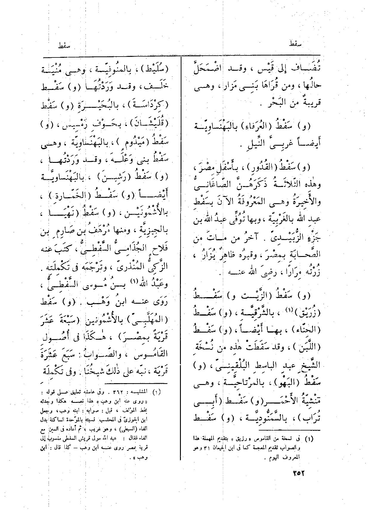 وسَفْطُ القُدُورِ، بأُسفَلِ مِصْرَ، وَهَذِه الثَّلاثَةُ ذَكَرَهُنَّ الصَّاغَانِيّ والأَخيرَةُ وَهِي المعروفَة الْآن بسَفْطِ عَبْدِ اللهِ بالغربيَّة، وَبهَا تُوُفِّي عبدُ الله بن جَزْءٍ الزُّبَيْدِيّ. آخرُ من ماتَ من الصَّحابَةِ بمِصْرَ، وقبرُه ظاهرٌ يُزارُ، زُرْتُه مِراراً، رَضِيَ الله عَنْه. وسَفْطُ الزَّيْت، وسَفْطُ زُرَيْق، بالشَّرْقِيَّةِ، وسَفْطُ الحِنَّاء، بهَا أَيْضاً، وسَفْطُ اللَّبَن، وَقَدْ سَقَطَتْ هَذِه من نُسخَةِ الشَّيخ عبدِ الباسِطِ البُلْقينِيّ، وسَفْطُ البَهْو، بالمُرْتاحِيَّة، وَهِي مَنْشِيَّةُ الأَحْمَر، وسَفْطُ أَبي تُراب، بالسَّمَنُّودِيَّة، وسَفْطُ سُلَيْط، بالمنُوفِيَّة، وَهِي مُنْيَة خَلَف، وَقَدْ وَرَدْتُها وسَفْطُ كِرْداسَة، بالبُحَيْرَةِ وسَفْطُ قُلَيْشانَ، بحَوْفِ رَمْسيس، وسَفْطُ مَيْدُوم، بالبهنَساوِيَّة، وَهِي سَفْطُ بني وَعْلَةَ، وَقَدْ وَرَدْتُها، وسَفْطُ رَشِينَ، بالبَهْنَساوِيَّة أَيْضاً، وسَفْطُ الخَمَّارَةِ، بالأُشْمُونَيْن، وسَفْطُ نَهْيَا، بالجِيزِيَّةِ، وَمِنْهَا مُرْهَفُ بن صارِمِ بن فَلاحٍ الجُذامِيُّ السَّفْطِيُّ، كتَبَ عَنهُ الزَّكِيُّ المُنْذرِيّ، وترجَمَهُ فِي تَكْمِلَتِه. وعبدُ الله بنُ موسَى السَّفْطِيُّ، روَى عَنهُ ابنُ وَهْب، وسَفْطُ المُهَلَّبِيّ بالأُشْمُونَيْن سَبْعَةَ عَشَرَ قَرْيَةً بمِصْرَ، هَكَذا فِي أُصولِ القامُوس، والصَّوَابُ: سَبَعَ عَشَرَةَ فَرْيَةً، نبَّه عَلَى ذلِكَ شَيْخُنَا. وَفِي تَكْمِلَةِ