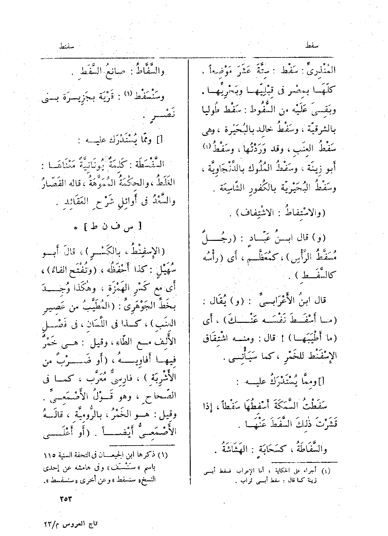 بالدِّنْجَاوِيَّة، وسَفْطُ البُحَيْريَّة بالكُفورِ الشَّاسِعَة. والاسْتِفاطُ: الاشْتِفافُ. وقالَ ابنُ عَبَّادٍ: رَجُلٌ مُسَفَّطُ الرَّأْسِ، كمُعَظَّم، أَي رأسُه كالسَّفَطِ. وقالَ ابْن الأَعْرَابِيّ: ويُقَالُ: مَا أَسْفَطَ نَفْسَه عنكَ، أَي مَا أَطْيَبَها قالَ: ومِنْهُ اشْتِقاقُ الإِسْفَنْط للخمرِ، كَمَا سَيَأْتِي. وممَّا يُسْتَدْرَكُ عَلَيْه: سَفَطْتُ السَّمَكَةَ أَسْفِطُها سَفْطاً، إِذا قَشَرْتَ ذلِكَ السَّفَطَ عَنْهَا. والسَّفاطَةُ، كسَحَابةٍ: الهَشَاشَةُ. والسَّفَّاطُ: صانعُ السَّفَطِ. وسَنْسَفْط: قريةٌ بِجَزِيرَة بني نَصْرٍ. وممَّا يُسْتَدْرَكُ عَلَيْه: السَّفْسَطَةُ: كلمةٌ يونانِيَّةٌ مَعْناها: الغَلَطُ، والحِكْمَةُ المُمَوَّهَةُ، قالَهُ القَصَّارُ والسَّعْدُ فِي أَوائِلِ شَرْحِ العَقائِدِ.