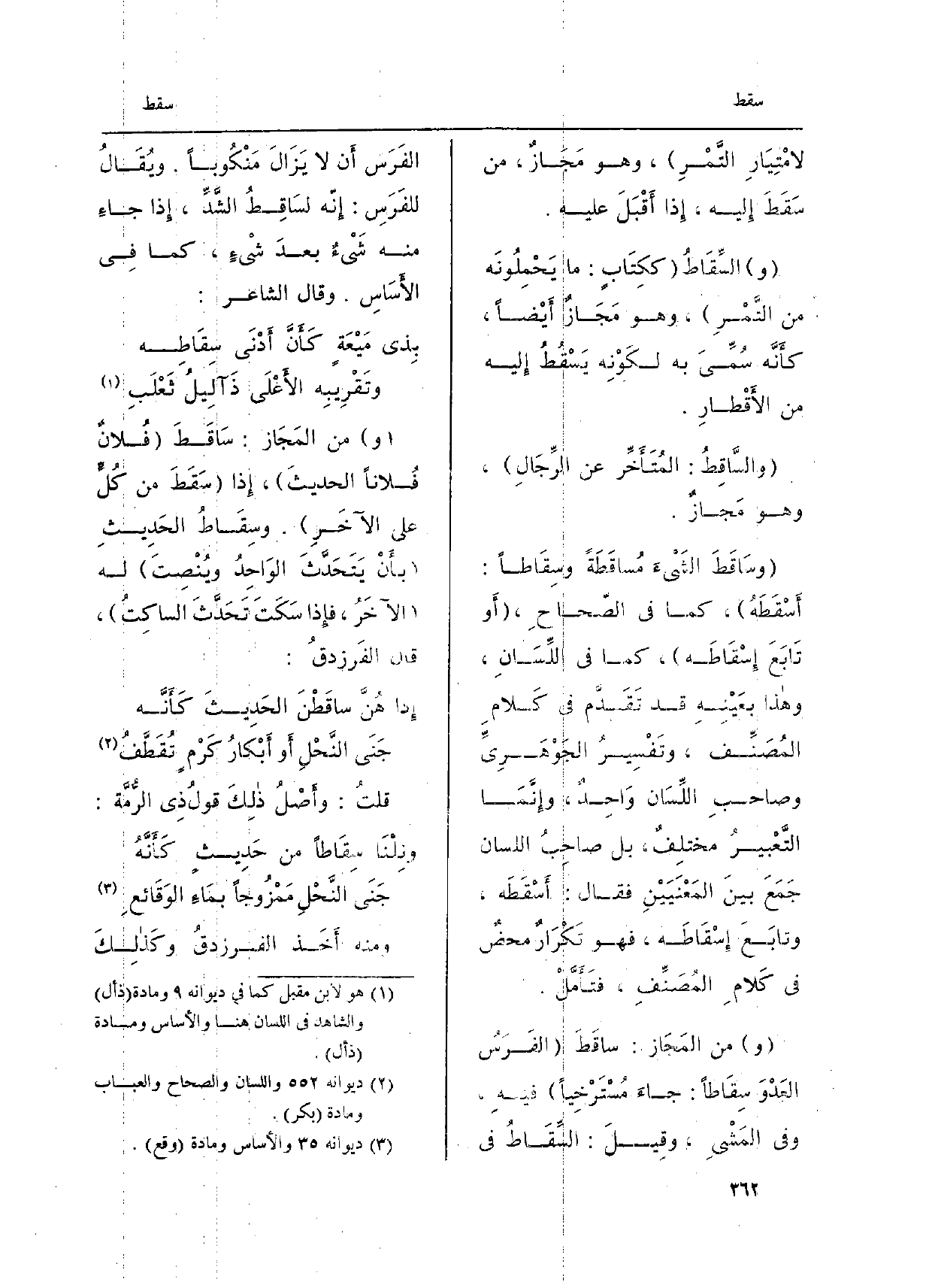 لامْتِيارِ التَّمْرِ، وَهُوَ مَجازٌ، من سَقَطَ إِلَيْهِ، إِذا أَقْبَلَ عَلَيْهِ. والسِّقاطُ ككِتابٍ: مَا يَحْمِلونَه من التَّمْرِ، وَهُوَ مَجازٌ أَيْضاً، كَأَنَّهُ سُمِّيَ بِهِ لكَوْنِه يَسْقُطُ إِلَيْهِ من الأقْطارِ. والسَّاقِطُ: المُتَأَخِّر عَن الرِّجالِ، وَهُوَ مَجازٌ. وساقَطَ الشَّيءَ مُساقَطَةً وسِقاطاً: أَسْقَطَهُ، كَمَا فِي الصّحاح، أَو تابَعَ إسْقاطَه، كَمَا فِي اللّسَان، وَهَذَا بعَيْنِه قَدْ تَقَدَّم فِي كَلَام المُصَنِّف، وتَفْسيرُ الجَوْهَرِيّ وصَاحِب اللّسَان واحِدٌ، وإنَّما التَّعْبيرُ مختلِفٌ، بَلْ صَاحِب اللّسَان جَمَعَ بَيْنَ المَعْنَيَيْنِ فَقَالَ: أسْقَطَه، وتَابَع إسْقاطَه، فَهُوَ تَكْرارٌ محضٌ فِي كَلَام المُصَنِّف، فتأَمَّل. وَمن المَجَازِ: ساقَطَ الفَرَسُ العَدْوَ سِقاطاً: جاءَ مُسْتَرْخِياً فِيهِ، وَفِي المَشْيِ، وقِيل: السِّقاطُ فِي الفَرَس أَن لَا يزالَ مَنْكوباً. ويُقَالُ للفَرَسِ: إِنَّهُ لساقِطُ الشَّدِّ، إِذا جَاءَ مِنْهُ شيءٌ بعدَ شيءٍ كَمَا فِي الأَسَاسِ. وقالَ الشَّاعِر: