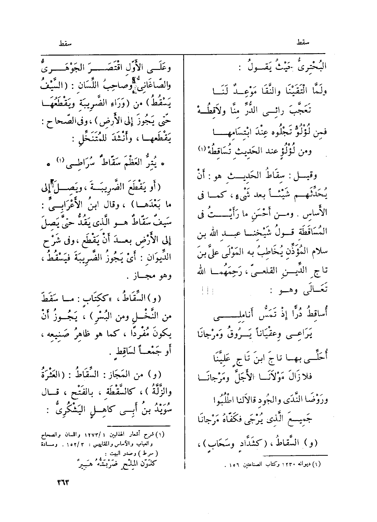 وقِيل: سِقاطُ الحديثِ هُوَ: أنْ يُحَدِّثَهُم شَيْئاً بعد شَيْءٍ، كَمَا فِي الأَسَاسِ. وَمن أَحْسَنِ مَا رَأَيْتُ فِي المُساقَطَةِ قَوْلُ شَيخنا عَبْدِ اللهِ بن سَلام المُؤذِّن يُخاطِبُ بِهِ المَوْلَى عليَّ بن تَاج الدِّين القلعيّ، رَحِمَهُما الله تَعَالَى وَهُوَ: