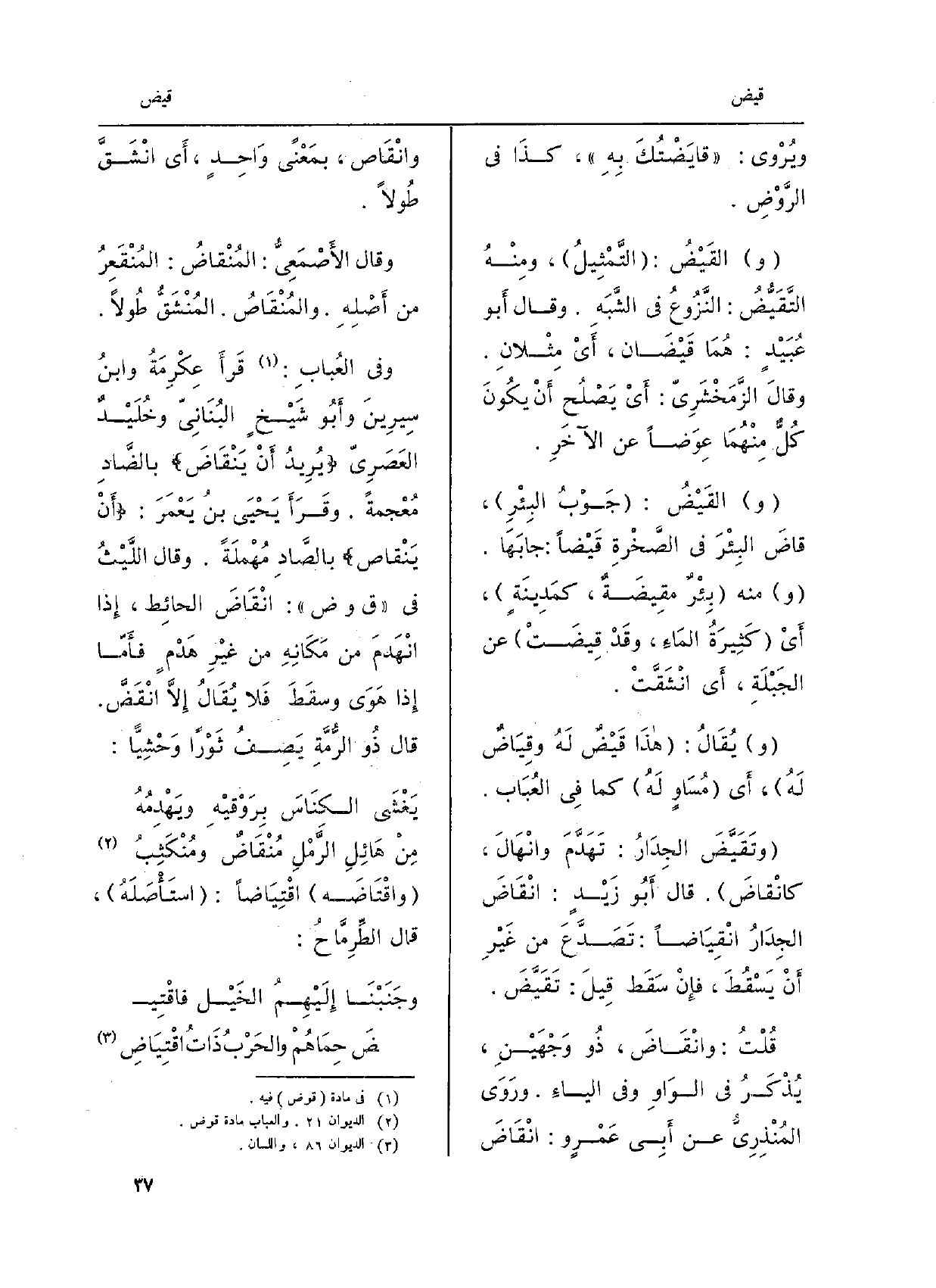وَقَالَ الأَصْمَعِيّ: {المُنْقاضُ: المُنْقَعِرُ من أَصلِهِ.} والمُنْقاصُ: المُنْشَقُّ طُولاً. وَفِي العُبَاب: قرأَ عِكْرِمَةُ وابنُ سِيرينَ وَأَبُو شيخٍ البُنانيّ وخُلَيْدٌ العَصَرِيّ: يُريدُ أَنْ {يَنْقاضَ بالضَّادِ مُعجمةً. وقرأَ يَحيى بنُ يَعْمَرَ: أَنْ يَنْقاص بالصَّاد مُهْملَة. وَقَالَ اللَّيْثُ فِي ق وض: انْقَاضَ الحائِط، إِذا انْهَدَمَ من مكانِهِ من غيرِ هَدْمٍ فأَمَّا إِذا هَوَى وسَقَطَ فَلَا يُقَالُ إلاَّ انْقَضَّ. قالَ ذُو الرُّمَّة يَصِفُ ثوراً وحْشيًّا: يَغْشَى الكِناسَ بِرَوْقيْهِ ويَهْدِمُهُ مِنْ هائِلِ الرَّمْلِ} مُنْقاضٌ ومُنْكَثِبُ {واقْتاضَهُ} اقْتِياضاً: استَأْصَلَهُ، قالَ الطِّرِمَّاحُ: