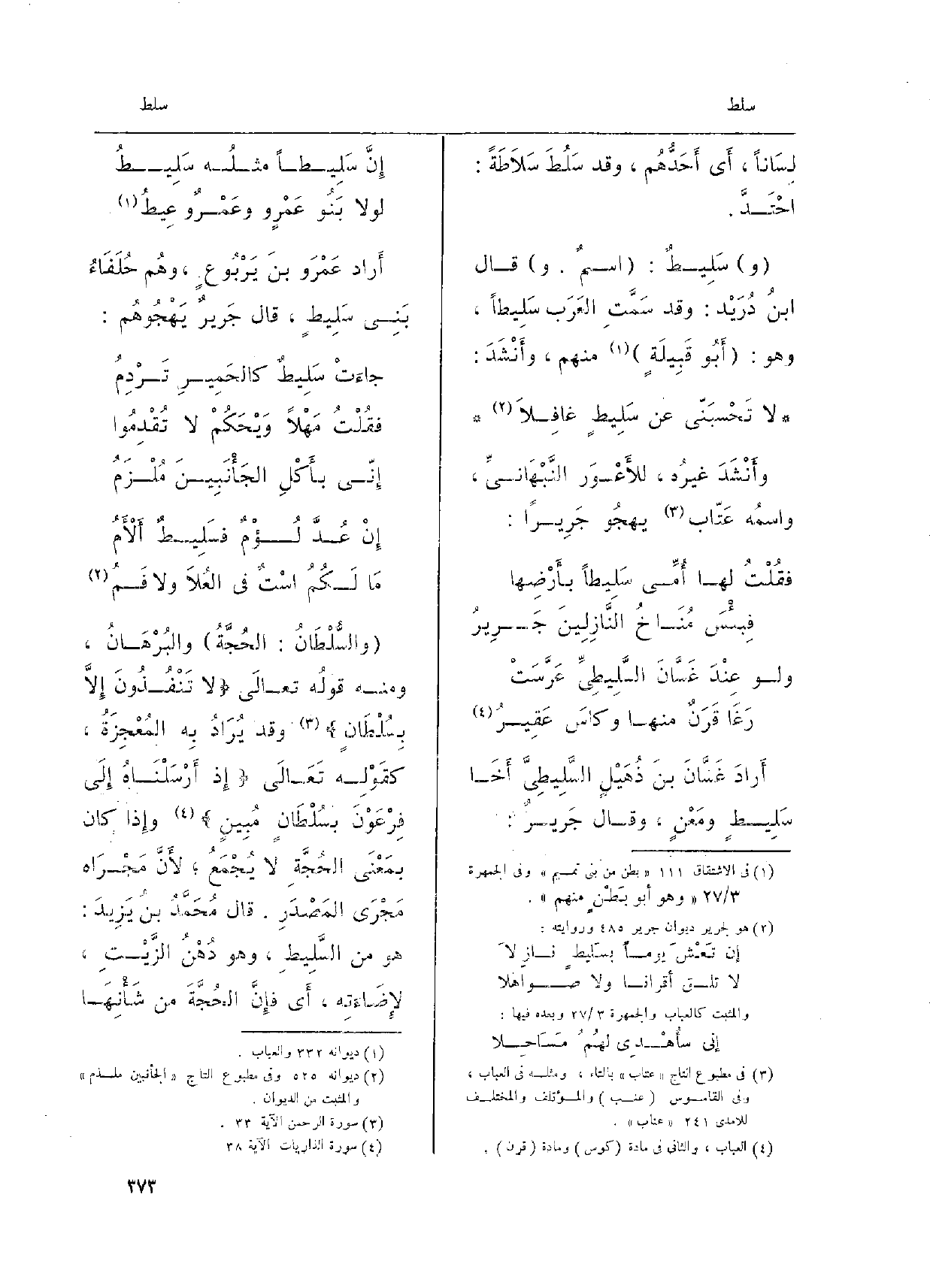 أَرادَ غَسَّانَ بن ذُهَيْلٍ السَّليطيَّ أَخا سَليطٍ ومَعْنٍ، وقالَ جَريرٌ إنَّ سَليطاً مثلُه سَليطُ لَوْلَا بَنو عَمْرٍ ووعَمْرٌ وعيطُ أَراد عَمْرو بن يَرْبوعٍ، وهم حُلَفاءُ بَني سَليطٍ، قالَ جَريرٌ يَهْجوهُم: جاءتْ سَليطٌ كالحَميرِ تَرْدِمُ فقُلْتُ مَهْلاً وَيْحَكُمْ لَا تُقْدِموا إنّي بأَكْلِ الجَأْنَبينَ مُلْزَمُ إنْ عُدَّ لُؤْمٌ فسَليطٌ أَلأَمُ مَا لَكُمُ اسْتٌ فِي العُلا وَلَا فَمُ والسُّلْطانُ: الحُجَّةُ والبُرْهانُ، ومِنْهُ قَوْله تَعَالَى: لَا تَنْفُذونَ إلاَّ بِسُلْطانٍ وَقَدْ يُرادُ بِهِ المُعْجِزَةُ، كَقَوْلِه تَعَالَى: إذْ أَرْسَلْناهُ إِلَى فِرْعَوْنَ بسُلْطانٍ مُبينٍ وَإِذا كانَ بمَعْنى الحُجَّةِ لَا يُجْمَعُ لأنَّ مَجْراه مَجْرى المَصْدَرِ. قالَ مُحمَّد بن يَزيد: هُوَ من السَّليطِ، وَهُوَ دُهْنُ الزَّيْتِ، لإضاءتِه، أَي فإِنَّ الحُجَّةَ من شَأْنِها
