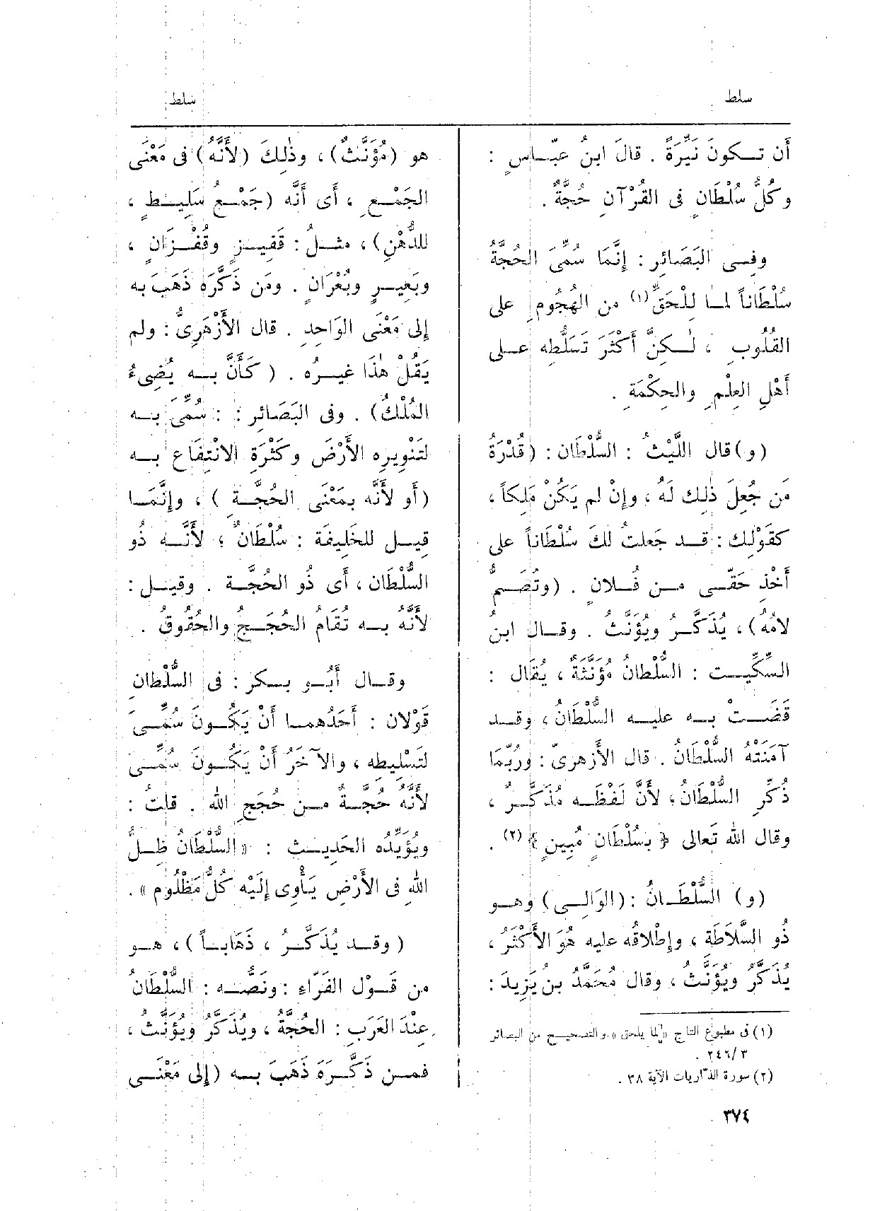 البَصائر: إنَّما سُمِّيَ الحُجَّةُ سُلْطاناً لما لِلْحَقِّ من الهُجومِ عَلَى القُلوبِ، لكِنَّ أكْثَرَ تَسَلُّطِه عَلَى أَهْلِ العِلْمِ والحِكْمَةِ. وقالَ اللَّيْثُ: السُّلْطان: قُدْرَةُ من جُعِلَ ذلِكَ لهُ، وَإِن لم يَكُنْ مَلِكاً، كَقَوْلِك: قَدْ جَعلتُ لكَ سُلْطاناً عَلَى أَخْذِ حَقّي من فُلانٍ. وتُضَمُّ لامُهُ، يُذَكَّرُ ويُؤَنَّثُ. وقالَ ابْن السِّكِّيتِ: السُّلْطانُ مُؤَنَّثَةٌ، يُقَالُ: قَضَتْ بِهِ عَلَيْهِ السُّلْطانُ، وَقَدْ آمَنَتْهُ السُّلْطانُ. قالَ الأّزْهَرِيّ: ورُبَّما ذُكِّرَ السُّلْطانُ لأنَّ لَفْظَه مُذَكَّرٌ، وقالَ الله تَعَالَى: بسُلْطانٍ مُبينٍ. والسُّلْطانُ: الْوَالِي وَهُوَ ذُو السَّلاطَةِ، وإطلاقُه عَلَيْهِ هُوَ الأكْثَرُ، يُذَكَّرُ ويُؤَنَّثُ، وقالَ محمَّدُ بن يَزيد: هُوَ مُؤَنَّثٌ، وذلِكَ لأَنَّهُ فِي معنى الجمعِ، أَي أَنَّهُ جمعُ سَلِيطٍ، للدُّهْنِ، مِثْلُ: قَفيزٍ وقُفْزانٍ، وبَعيرٍ وبُعْرانٍ. وَمن ذَكَّرَه ذَهَبَ بِهِ إِلَى معنى الواحِدِ، قالَ الأّزْهَرِيّ: وَلم يَقُلْ هَذَا غيرُه. كأَنَّ بِهِ يُضيءُ المُلْكُ. وَفِي البَصائرِ: سُمِّيَ بِهِ لتَنْويرِهِ الأَرْضَ وكَثْرَةِ الانْتِفاع بِهِ، أَو لأَنَّه بمَعْنَى الحُجَّةِ، وإِنَّما قِيل للخَليفَةِ: سُلْطانٌ لأنَّه ذُو السُّلْطان، أَي ذُو الحُجَّة. وقِيل: لأَنَّه بِهِ تُقامُ الحُجَجُ والحُقوقُ. وقالَ أَبُو بكر: فِي السُّلْطانِ قولانِ: أَحَدُهما أَن يكونَ سُمِّيَ لتَسْليطِهِ، والآخرُ أَن يكونَ سُمِّيَ لأَنَّه حُجَّةٌ من حُجَجِ الله. قُلْتُ: ويُؤَيِّدُهُ الحَديثُ: السُّلْطانُ ظِلُّ الله فِي الأَرْضِ يأْوي إِلَيْه كلُّ مَظْلُوم. وَقَدْ يُذَكَّرُ، ذَهَاباً، هُوَ من قولِ الفَرَّاءِ: ونَصُّه: السُّلْطانُ عندَ العَرَبِ: الحُجَّةُ، ويُذَكَّرُ ويُؤَنَّثُ، فَمن ذَكَّرَهُ ذَهَبَ بِهِ إِلَى معنى