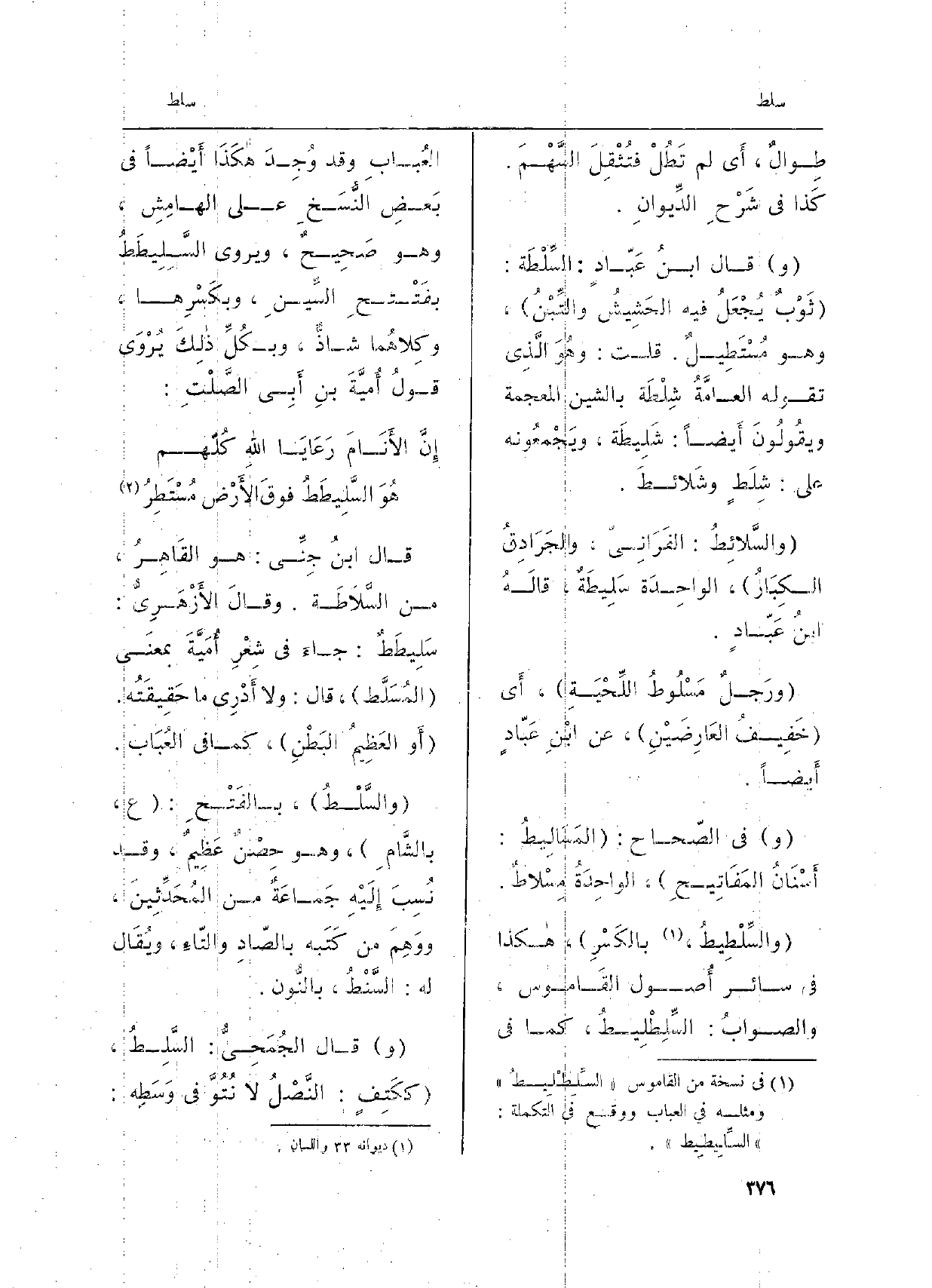 قالَ ابنُ جِنِّي: هُوَ القاهِرُ، من السَّلاَطَةَِ. وقالَ الأّزْهَرِيّ: سَلِيطَطٌ: جاءَ فِي شِعْرِ أُميَّةَ بمَعْنَى المُسَلَّط، قالَ: وَلَا أَدْري مَا حَقيقَتُه. أَو العظيمُ البَطْنِ، كَمَا فِي العُبَاب. والسَّلْطُ، بالفَتْحِ: ع، بالشَّامِ، وَهُوَ حِصْنٌ عَظيمٌ، وَقَدْ نُسِبَ إِلَيْه جَماعةٌ من المُحَدِّثِين، ووَهِمَ من كَتَبه بالصَّادِ والتَّاءِ، ويُقَالُ لَهُ: السَّنْطُ، بالنُّونِ. وقالَ الجُمَحِيُّ: السَّلِطُ، ككَتِفٍ: النَّصْلُ لَا نُتُوَّ فِي وَسَطِه.