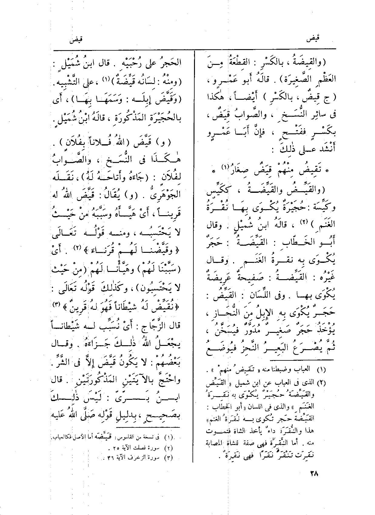 وَفِي اللّسَان: {القِيِّضُ: حجرٌ يُكوى بهِ الإبِلُ من النُّحازِ، يُؤْخَذُ حجرٌ صَغيرٌ مُدَوَّرٌ فيُسَخَّنُ، ثمَّ يُصْرَعُ البَعيرُ النَّحِزُ فيُوضَعُ الحجرُ عَلَى رُحْبَيْهِ. قالَ ابنُ شُمَيْلٍ: ومِنْهُ: لسانُهُ} قِيِّضَةٌ، عَلَى التَّشبيهِ. {وَقَيَّضَ الله إبِلَهُ: وسمها بهَا، أَي بالحجيرة الْمَذْكُورَة، قَالَه ابْن شُمَيْل و} قَيَّض الله فُلاناً بفُلانٍ. هكَذَا فِي النُّسَخِ، والصَّوابُ لفُلانٍ: جاءهُ وأَتاحَهُ لهُ، نَقَلَهُ الجَوْهَرِيّ. ويُقَالُ: قَيَّضَ الله لهُ قَريناً، أَي هَيَّأَهُ وسبَّبَهُ من حيثُ لَا يحتسِبُه، ومِنْهُ قَوْله تَعَالَى {وقَيَّضْنا لهُمْ قُرَناءَ. أَي سَبَّبْنا لَهُم وهيَّأْنا لَهُم مِنْ حَيْثُ لَا يحتسِبون، وكَذلِكَ قَوْله تَعَالَى} نُقَيِّضْ لهُ شيْطاناً فهوَ لهُ قَرينٌ. قالَ الزَّجَّاج: أَي نُسَبِّبُ لهُ شيْطاناً يجعَلُ اللهُ ذَلِك جزاءهُ. وَقَالَ بعضُهُمْ: لَا يكونُ قَيَّضَ إلاَّ فِي الشَّرِّ. واحتَجَّ بالآيَتَيْنِ المذكورتينِ. قالَ ابنُ بَرِّيّ: لَيْسَ ذَلِك بصَحيحٍ، بدليلِ قَوْله صَلّى اللهُ عَلَيْهِ