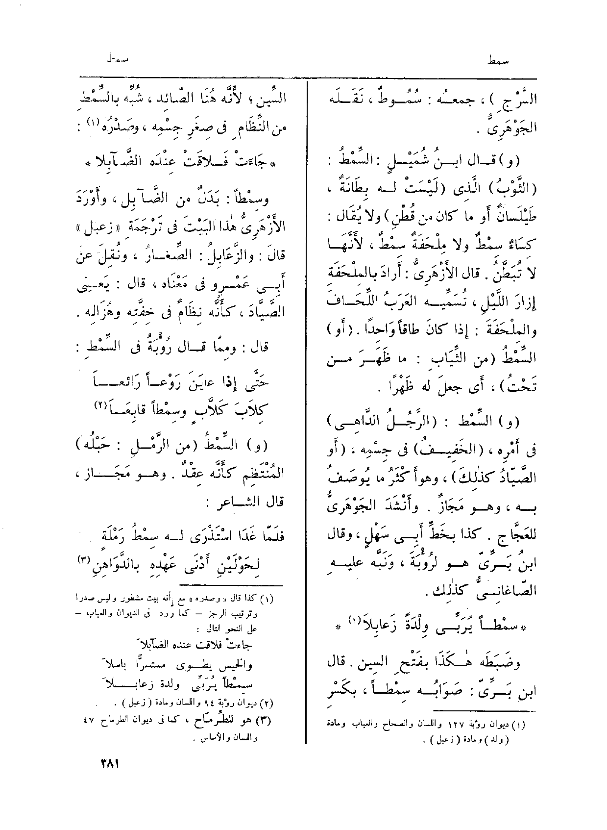فِي أَمرِهِ، الخَفيفُ فِي جِسْمِهِ، أَو الصَّيَّادُ كَذلِكَ، وَهُوَ أَكثرُ مَا يُوصَفُ بِهِ، وهُو مَجَازٌ. وأَنْشَدَ الجَوْهَرِيّ للعجَّاج. كَذَا بخطِّ أَبي سَهْلٍ، وقالَ ابنُ بَرِّيّ: هُوَ لرُؤْبَةَ، ونبَّهَ عَلَيْهِ الصَّاغَانِيّ كَذلِكَ: سَمْطاً يُرَبِّي وِلْدَةً زَعَابِلاَ وضَبَطَهُ هَكَذا بفتحِ السِّين. قالَ ابنُ بَرِّيّ: صوابُه سِمْطاً، بكسرِ السِّين لأَنَّه هُنا الصَّائِدُ، شُبِّه بالسِّمْطِ من النِّظامِ فِي صِغَرِ جِسْمِه، وصَدْرُه: جَاءَتْ فَلاقَت عِنْدَه الضَّآبِلا وسِمْطاً: بَدَلٌ من الضَّآبلِ، وأَوْرَدَ الأّزْهَرِيّ هَذَا البيتَ فِي ترجَمَةِ زعبل، قالَ: والزَّعابِلُ: الصِّغارُ، ونُقِلَ عَن أَبي عمرٍ وَفِي مَعْنَاهُ: قالَ: يَعْنِي الصَّيَّادَ، كَأَنَّهُ نِظامٌ فِي خِفَّتِه وهُزالِه. قالَ: وممَّا قالَ رُؤْبَةُ فِي السِّمْطُ: حتَّى إِذا عايَنَ رَوْعاً رَائعا كِلاَبَ كَلاَّبٍ وسِمْطاً قابِعَا والسِّمْطُ من الرَّملِ: حَبْلُه المُنْتَظِم كَأَنَّهُ عِقْدٌ. وهُو مَجَازٌ. قالَ الشَّاعِر: