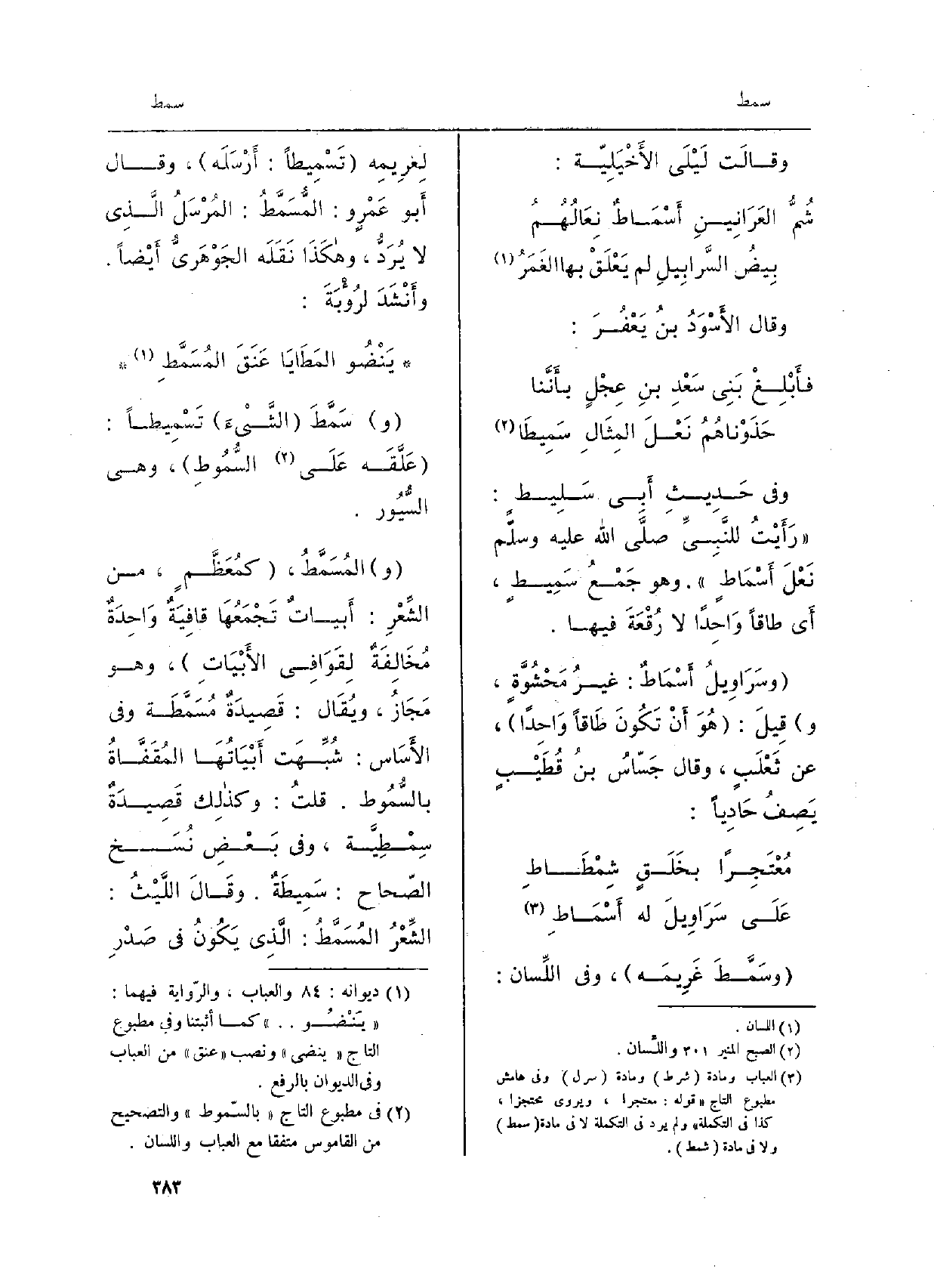 وَفِي حَديثِ أَبي سَلِيطٍ: رَأَيْتُ للنَّبِيّ صَلّى اللهُ عَلَيْهِ وسَلّم نَعْلَ أَسْماطٍ. وَهُوَ جمْعُ سَمِيطٍ، أَي طاقاً وَاحِدًا لَا رُقْعَةَ فِيهَا. وسَراوِيلُ أَسْماطٌ: غيرُ مَحْشُوَّةٍ، وقِيل: هُوَ أَنْ تكونَ طاقاً وَاحِدًا، عَن ثَعْلَبٍ، وقالَ جَسَّاسُ بنُ قُطَيْبٍ يَصِفُ حادِياً: مُعْتَجِراً بخَلَقٍ شِمْطَاطِ عَلَى سَرَاوِيلَ لَهُ أَسْمَاطِ وسَمَّطَ غَريمَه، وَفِي اللّسَان: لغَريمِه تَسْميطاً: أَرْسَلَه، وقالَ أَبُو عمرٍ و: المُسَمَّطُ: المُرْسَلُ الَّذي لَا يُرَدُّ، وَهَكَذَا نَقَلَهُ الجَوْهَرِيّ أَيْضاً. وأَنْشَدَ لرُؤْبَةَ: يَنْضُو المَطَايَا عَنَقَ المُسَمَّطِ وسَمَّطَ الشَّيْءَ تَسْميطاً: علَّقَه عَلَى السُّمُوطِ، وَهِي السُّيُور. والمُسَمَّطُ: كمُعَظَّمٍ، من الشِّعْرِ: أَبياتٌ تَجْمَعُها قافيةً وَاحِدَة مُخالِفَةٌ لقَوافِي الأَبياتِ، وهُو مَجَازٌ، ويُقَالُ: قصيدةٌ مُسَمَّطَة، وَفِي الأَسَاسِ: شُبِّهَتْ أَبياتُها المُقَفَّاةُ بالسُّمُوط. قُلْتُ: وكَذلِكَ قصيدةٌ سِمْطِيَّةٌ، وَفِي بعضِ نُسَخِ الصّحاح: سَمِيطَةٌ. وقالَ اللَّيْثُ: الشِّعرُ المُسَمَّطُ: الَّذي يَكُونُ فِي صَدْرِ