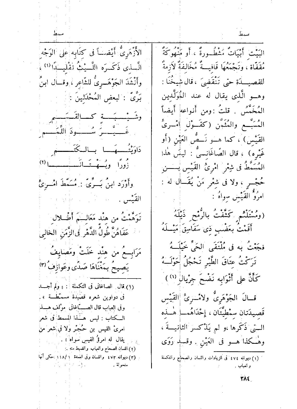 قالَ الجَوْهَرِيّ: ولامرِئِ القَيْسِ قَصيدَتان سِمْطِيَّتان، إِحداهُما هَذِه الَّتِي ذَكَرها، وَلم يذْكر الثَّانيةَ، وَهَكَذَا هُوَ فِي العَيْن. وَقَدْ رَوَى الأّزْهَرِيّ أَيْضاً فِي كِتابِه عَلَى الوَجْهِ الَّذي ذَكَرَهُ اللَّيْثُ تَقْليداً، وأَنْشَدَ الجَوْهَرِيّ للشَّاعِر، وقالَ ابنُ بَرِّيّ: لبعضِ المُحَدِّثِين: