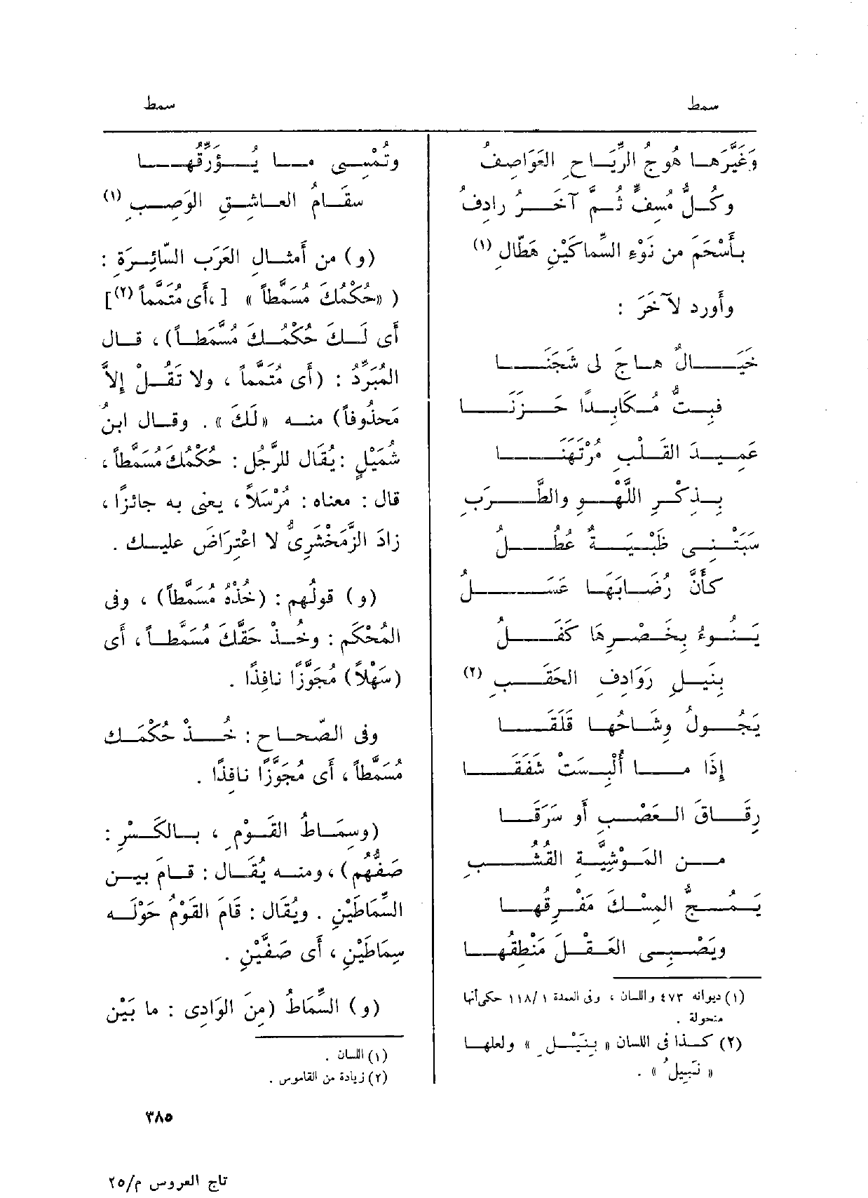 وَمن أَمثال الْعَرَب السَّائرةَ: حُكْمُكَ مُسَمَّطاً، أَي مُتَمَّماً أَي لَك حُكْمُكَ مُسَمَّطاً، قالَ المُبَرِّدُ: أَي مُتَمَّماً، وَلَا تقُلْ إلاَّ محذُوفاً مِنْهُ لَكَ. وقالَ ابنُ شُمَيْلٍ: يُقَالُ للرَّجُل: حُكْمُكَ مُسَمَّطاً، قالَ: مَعْنَاهُ: مُرْسَلاً، يَعْنِي بِهِ جَائِزا، زادَ الزَّمَخْشَرِيُّ لَا اعْتِراضَ عَلَيْك. وقولُهم: خُذْهُ مُسَمَّطاً، وَفِي المُحْكَمِ: وخُذْ حقَّكَ مُسَمَّطاً، أَي سَهْلاً، مُجَوَّزاً نافِذاً. وَفِي الصّحاح: خُذْ حُكْمَك مُسَمَّطاً، أَي مُجَوَّزاً نافِذاً. وسِماطُ القومِ، بالكَسْرِ: صَفُّهُم، ومِنْهُ يُقَالُ: قامَ بَيْنَ السِّماطَيْنِ. ويُقَالُ: قامَ القومُ حولَه سِمَاطَيْنِ، أَي صَفَّيْنِ. والسِّماطُ من الْوَادي: مَا بَيْنَ