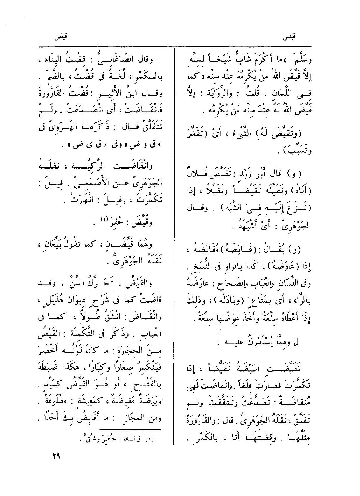 وقِضْتُها أَنا، بالكَسْرِ. وَقَالَ الصَّاغَانِيُّ: {قِضْتُ البِناءَ، بالكَسْرِ، لغةٌ فِي} قُضْتُ، بالضَّمِّ. وَقَالَ ابنُ الأَثيرِ: قُضْتُ القارورَةَ {فانْقَاضَتْ، أَي انْصَدَعَتْ. وَلم تَتَفَلَّقْ، قالَ: ذَكَرَها الهَرَوِيّ فِي ق وض وَفِي ق ي ض.} وانْقَاضَتْ الرَّكِيَّة، نَقَلَهُ الجَوْهَرِيّ عَن الأَصْمَعِيّ. قيل: تَكَسَّرَتْ، وقيلَ: انْهارَتْ. {وقُيِّضَ: حُفِرَ. وهما} قَيِّضانِ، كَمَا تقولُ بَيِّعانِ، نَقَلَهُ الجَوْهَرِيّ. {والقَيْضُ: تَحَرُّكُ السِّنِّ، وَقَدْ} قاضَتْ كَمَا فِي شرحِ ديوَان هُذَيْلٍ، {وانْقَاضَ: انشَقَّ طُولاً، كَمَا فِي العُبَاب. وَذكر فِي التَّكْمِلَة: القَيْضُ من الحِجارَةِ: مَا كانَ لونُه أَخضرَ فينْكَسِرُ صِغاراً وكِباراً، هَكَذا ضَبطه بالفَتْحِ، أَو هُوَ} القَيِّضُ كسَيِّدٍ. وبيْضَةٌ {مَقِيضَةٌ، كمَعيشَةٍ: مَفْلوقَةٌ. وَمن المَجاز: مَا} أُقايِضُ بكَ أَحداً.