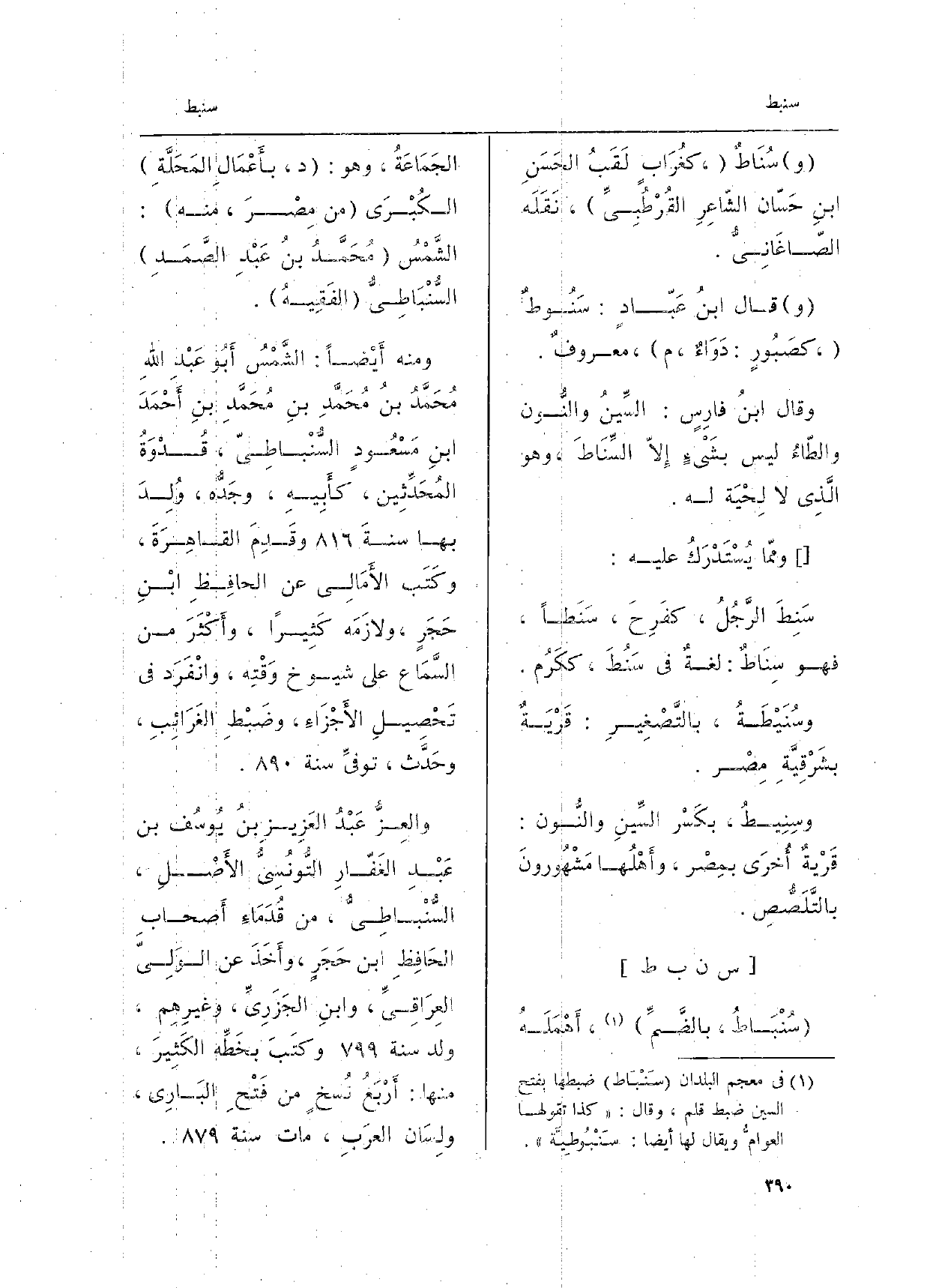 سُنْباطُ، بالضَّمِّ، أَهْمَلَهُ الجَماعَةُ، وَهُوَ: د، بأَعْمالِ المَحَلَّةِ الكُبْرَى من مِصْرَ، مِنْهُ: الشَّمْسُ مُحَمَّدُ بن عبد الصَّمَدِ السُّنْباطِيُّ الفَقيهُ. ومِنْهُ أَيْضاً: الشَّمْسُ أَبُو عَبْدِ اللهِ مُحَمَّد بن مُحَمَّد بن مُحَمَّد بن أَحْمَد ابْن مَسْعودٍ السُّنْباطِيّ، قُدْوَةُ المُحَدِّثين، كأَبيه، وجَدُّه، وُلِدَ بهَا سنة وقَدِمَ القاهِرَةَ، وكَتَب الأمالي عَن الْحَافِظ ابْن حَجَرٍ، ولازَمَه كَثيراً، وأَكْثَرَ من السَّماع عَلَى شُيُوخ وَقْتِه، وانْفَرَد فِي تَحْصيل الأَجْزاءِ، وضَبْطِ الغَرائِبِ، وحَدَّث، توفِّي سنة. والعِزُّ عَبْدُ العَزيز بن يوسُف بن عَبْدِ الغَفّارِ التُّونُسِيُّ الأصْلِ، السُّنْباطِيُّ، من قُدَماء أَصحاب الحافِظِ ابْن حَجَرٍ، وأَخَذَ عَن الوَلِيّ العِراقِيِّ، وَابْن الجَزَرِيِّ، وغيرِهِم، ولد سنة وكَتَبَ بخَطِّه الكَثيرَ، مِنْهَا: أَرْبَعُ نُسَخٍ من فَتْحِ الْبَارِي، ولِسان العَرَبِ، مَاتَ سنة.