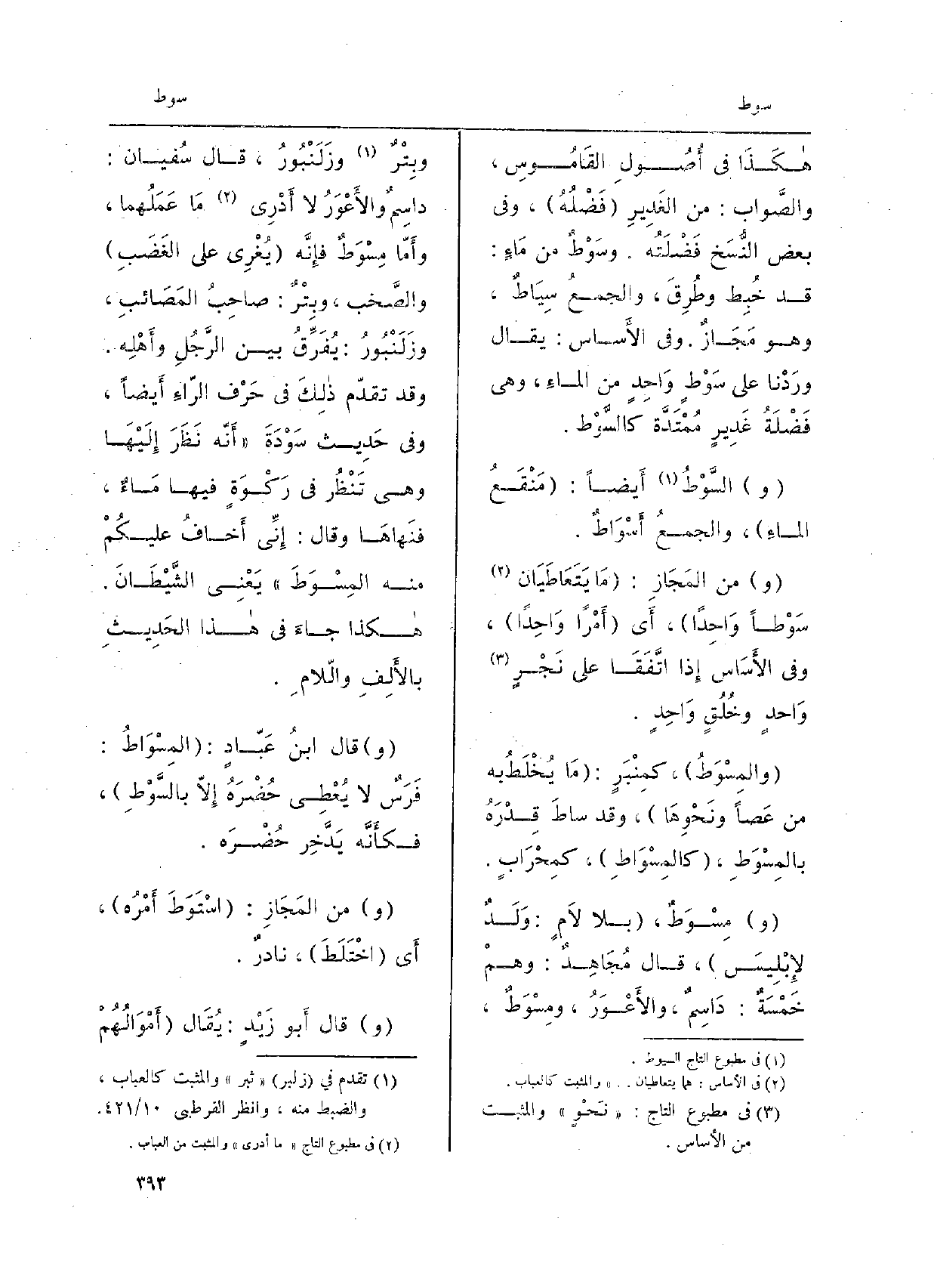 والصَّواب: من الغَديرِ فَضْلُهُ، وَفِي بعض النُّسَخ فَضْلَتُه. {وسَوْطٌ من ماءٍ: قَدْ خُبِط وطُرِقَ، والجمعُ} سِياطٌ، وَهُوَ مَجازٌ. وَفِي الأَسَاسِ: يُقَالُ ورَدْنا عَلَى سَوْطٍ واحِدٍ من الماءِ، وَهِي فَضْلَةُ غَديرٍ مُمْتَدَّة {كالسَّوْط. و} السَّوْطُ أَيْضاً: مَنْقَعُ الماءِ، والجمعُ {أَسْواطٌ. وَمن المَجَازِ: مَا يَتَعاطَيان} سَوْطاً واحِداً، أَي أَمْراً واحِداً، وَفِي الأَسَاسِ إِذا اتَّفَقا عَلَى نَجْرٍ واحدٍ وخُلُقٍ واحِدٍ. {والمِسْوَطُ، كمِنْبَرٍ: مَا يُخْلَطُ بِهِ من عَصاً ونَحْوِها، وَقَدْ} ساطَ قِدْرَهُ {بالمِسْوَطِ،} كالمِسْواطِ، كمِحْرابٍ.