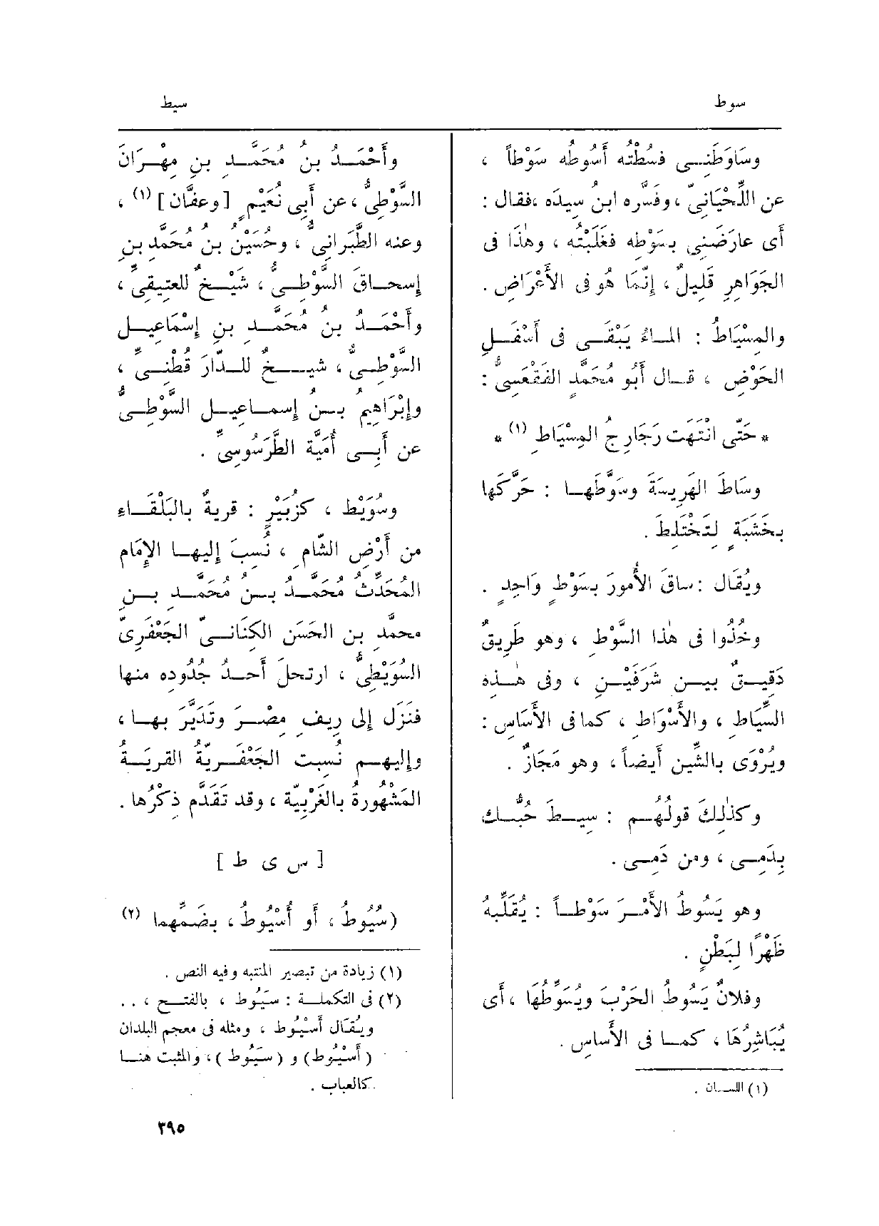 ويُرْوَى بالشِّين أَيْضاً، وَهُوَ مَجازٌ. وكَذلِكَ قولُهُم: {سيطَ حُبُّك بِدَمي، وَمن دَمي. وَهُوَ} يَسوطُ الأمْرَ {سَوْطاً: يُقَلِّبهُ ظَهْراً لِبَطْنٍ. وفلانٌ} يَسوطُ الحَرْبَ ويُسَوِّطُها، أَي يُباشِرُها، كَمَا فِي الأَسَاسِ. وأحْمَدُ بن مُحَمَّدِ بن مِهْرانَ {السَّوْطِيُّ، عَن أَبي نُعَيْمٍ وعفَّان، وَعنهُ الطَّبَرانِيُّ، وحُسَيْنُ بن محمَّد بن إسحاقَ السَّوْطِيُّ، شَيْخٌ للعتيقيِّ، وأَحْمَدُ بن مُحَمَّد بن إِسْمَاعِيل السَّوْطِيُّ، شيخٌ للدّارِ قُطْنِيِّ، وَإِبْرَاهِيم بن إِسْمَاعِيل السَّوْطِيُّ عَن أَبي أُمَيَّة الطَّرَسوسِيِّ.} وسُوَيْط، كزُبَيْرٍ: قريةٌ بالبَلْقاءِ من أرضِ الشّام، نُسِبَ إِلَيْهَا الإِمَام المُحَدِّثُ مُحَمَّد بن مُحَمَّد بن محمَّد بن الحَسَن الكِنانيّ الجَعْفَرِيّ {- السُوَيْطِيُّ، ارتحلَ أحدُ جُدودِه مِنْهَا فنَزَل إِلَى ريفِ مِصْرَ وتَدَيَّرَ بهَا، وإليهم نُسِبت الجَعْفَرِيّةُ القريَةُ المَشْهورةُ بالغَرْبِيّة، وَقَدْ تَقَدَّم ذِكْرُها.