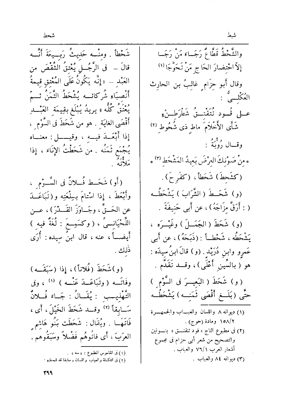 وقالَ رُؤْبَةُ. مِنْ صَوْنِكَ العِرْضَ بَعيدُ المَشْحَطِ كشَحِطَ شَحَطاً، كفَرِحَ. وشَحَطَ الشَّرابَ يَشْحَطُه: أَرَقَّ مِزاجَهُ، عَن أَبي حَنيفَةَ. وشَحَطَ الجَمَلَ وغَيْرَه، يَشْحَطُه، شَحْطاً: ذَبَحَهُ، عَن أَبي عَمرٍ ووابن دُرَيْدٍ. وقالَ ابنُ سِيدَه: هُوَ بالسِّين أَعْلَى، وَقَدْ تَقَدَّم. وشَحَطَ البَعيرَ فِي السَّوْمِ حتَّى بَلَغ أَقْصى ثَمَنِه يَشْحَطُه شَحْطاً. ومِنْهُ حَديثُ رَبيعَةَ أَنَّهُ قالَ فِي الرَّجُلِ يُعْتِقُ الشِّقْصَ من العَبْدِ إِنَّهُ يَكُونُ عَلَى المُعْتِقِ قيمةُ أنْصِباءِ شُركائه يُشْحَطُ الثَّمَنُ ثمَّ يُعْتَقُ كُلُّه يريدُ يُبْلَغ بقيمَةِ العَبْدِ أَقْصَى الغايَةِ. هُوَ من شَحَطَ فِي السَّوْمِ، إِذا أَبْعَدَ فِيهِ، وقِيل: مَعْنَاهُ يُجْمَع ثَمَنُه. من شَحَطْتُ الإناءَ، إِذا مَلأتَهُ. أَو شَحَط فُلانٌ فِي السَّوْمِ، وأَبْعَطَ، إِذا اسْتامَ بسِلْعَتِه وتَباعَدَ عَن الحَقِّ، وجاوَزَ القَدْرَ، عَن اللِّحْيانِيّ، وكسَمِعَ: لُغَةٌ فِيهِ أَيْضاً، عَنهُ، قالَ ابْن سِيدَه: أُرى ذلِكَ. وشَحَطَ فُلاناً، إِذا سَبَقَه وفاتَه وتَباعَدَ عَنه، وَفِي التَّهذِيب: يُقَالُ: جاءَ فُلانٌ سابِقاً وَقَدْ شَحَطَ الخَيْلَ، أَي فاتَها. ويُقَالُ: شَحَطَت بَنو هاشِمٍ العرَبَ، أَي فاتوهُم فَضْلاً وسَبَقوهم.