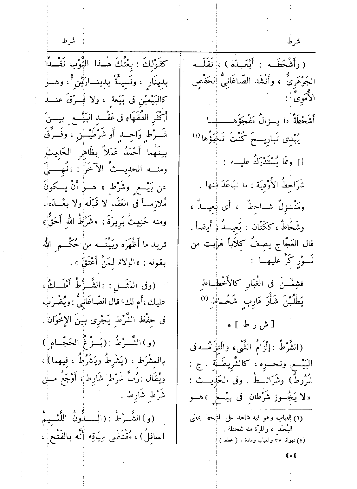 الشَّرْطُ: إلْزامُ الشَّيْء والْتِزامُه فِي البَيْع ونحوِه، كالشَّريطَةِ، ج: شُروطٌ وشَرائطُ. وَفِي الحَديث: لَا يَجوز شَرْطانِ فِي بَيْعٍ هُوَ كقَوْلكَ: بِعْتُكَ هَذَا الثَّوْب نَقْداً بدينارٍ، ونَسيئَةً بدينارَيْن، وَهُوَ كالبَيْعيْنِ فِي بَيْعةٍ، وَلَا فرقَ عندَ أَكْثَرِ الفُقَهاءِ فِي عَقْدِ البَيْعِ بَيْنَ شرطٍ واحِدٍ أَو شَرْطَيْنِ، وفرَّقَ بينَهُما أَحْمَدُ عَمَلاً بظاهِرِ الحَديثِ ومِنْهُ الحَديثُ الآخَرُ: نُهِيَ عَن بَيْعٍ وشَرْطٍ هُوَ أَن يكونَ مُلازِماً فِي العقدِ لَا قَبْلَه وَلَا بعدَه، ومِنْهُ حديثُ بَرِيرَةَ: شَرْطُ الله أَحَقُّ تُرِيدُ مَا أَظْهَرَه وبَيَّنَه من حُكْمِ الله بقوله: الولاءُ لمَنْ أَعْتَقَ. وَفِي المَثَلِ: الشَّرطُ أَمْلَكُ، عَلَيْك، أَم لَك قالَ الصَّاغَانِيّ: ويُضْرِبُ فِي حفظِ الشَّرْطِ يجَرِي بَيْنَ الإِخْوان. والشّرْطُ: بَزْغُ الحَجَّامِ بالمِشْرَطِ، يَشْرِطُ ويَشْرُطُ، فيهمَا، ويُقَالُ: رُبَّ شَرْطِ شَارِط، أَوْجَعُ من شَرْطِ شَارِط. والشّرْطُ: الدُّونُ اللَّئيمُ السَّافِلُ، مُقْتَضى سِياقِه أَنَّهُ بالفَتْحِ،