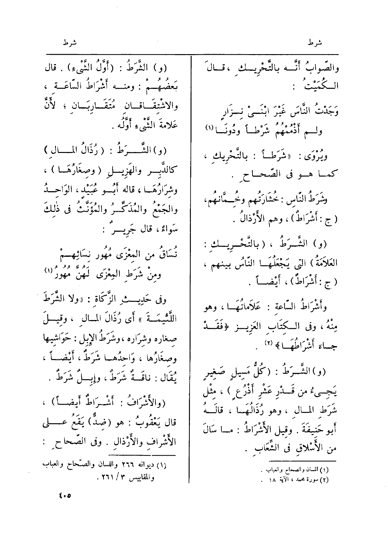 وَفِي حديثِ الزَّكاةِ: وَلَا الشَّرَطَ اللَّئيمَةَ رُذال المالِ، وقِيل صِغارُه وشِرارُه، وشَرَطُ الإِبِل: حَوَاشيها وصِغارُها، واحِدُها شَرَطٌ، أَيْضاً، يُقَالُ: ناقةٌ شَرَطُ، وإِبِلٌ شَرَطٌ. والأَشْرافُ: أَشْرَاطٌ أَيْضاً، قالَ يَعْقُوبُ: هُوَ ضِدٌّ، يَقَع عَلَى الأشْرافِ والأَرْذالِ، وَفِي الصّحاح:
