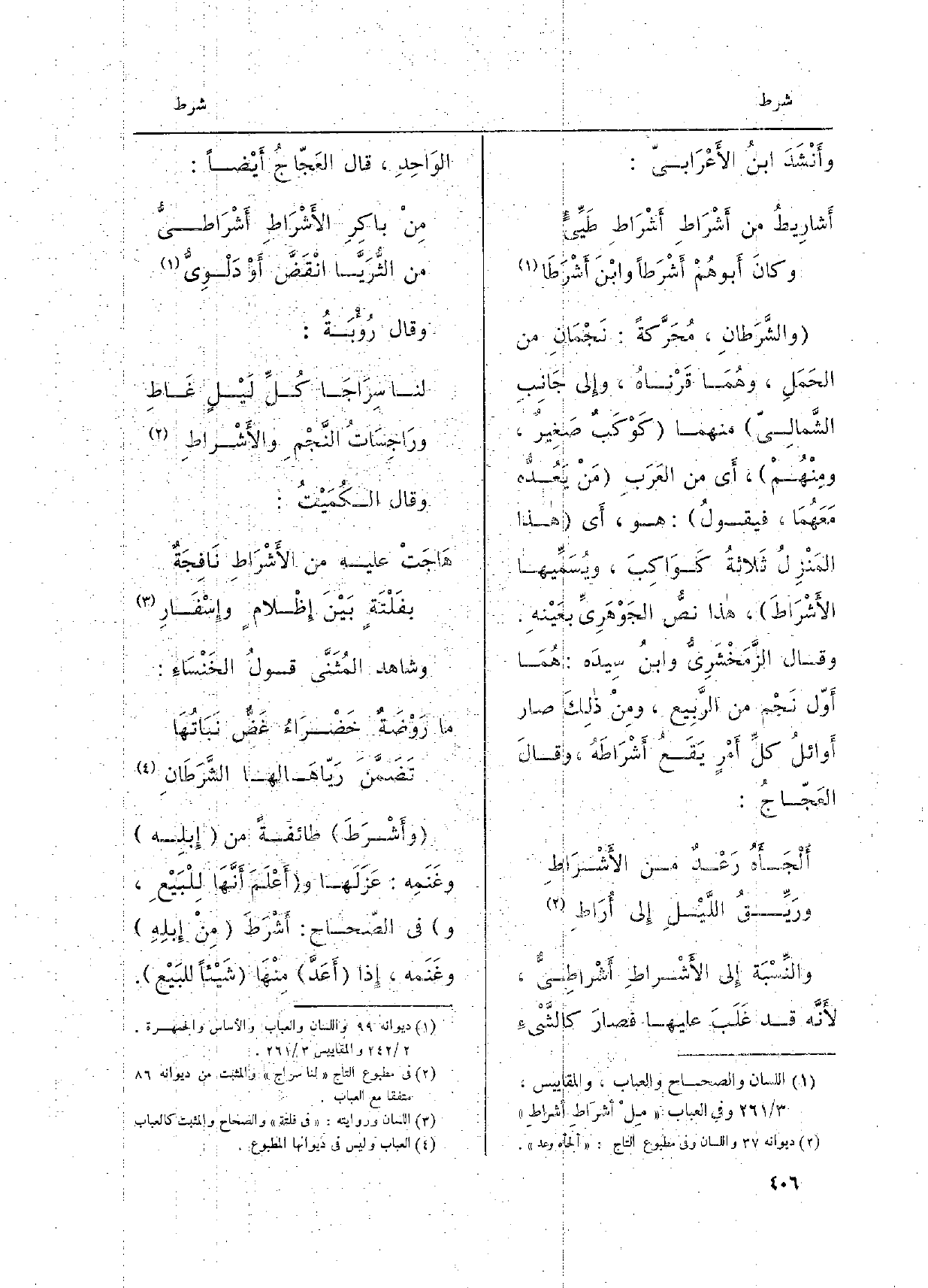 والشَّرَطانِ، مُحَرَّكَةً: نَجمانِ من الحَمَلِ، وهُما قَرْناهُ، وإِلى جانِبِ الشَّمالِيِّ مِنْهُمَا كوكَبٌ صَغيرٌ، وَمِنْهُم، أَي من العَرَبِ مَنْ يَعُدُّه مَعَهُما، فيقولُ: هُوَ، أَي هَذَا المنزِلُ ثلاثَةُ كَواكِبَ، ويُسَمِّيها الأَشْرَاطُ، هَذَا نصُّ الجَوْهَرِيّ بعَيْنِه. وقالَ الزَّمَخْشَرِيُّ وابنُ سِيدَه: هُما أَوَّل نَجْم من الرَّبيع، وَمن ذلِكَ صَار أَوائِلُ كلِّ أَمرٍ يقَعُ عَلَى أَشْرَاطَهُ، وقالَ العَجَّاجُ: أَلْجَأَهُ رَعْدٌ من الأَشْرَاطِ ورَيِّقُ اللَّيْلِ إِلَى أُرَاطِ والنِّسبَةُ إِلَى الأَشْرَاطِ أَشْرَاطِيٌّ، لأنَّه قَدْ غلبَ عَلَيْهَا فصارَ كالشَّيءِ الواحِدِ، قالَ العَجَّاجُ أَيْضاً: مِنْ باكِرِ الأَشْرَاطِ أَشْرَاطيُّ من الثُّرَيَّا انْقَضَّ أَوْ دَلْوِيُّ وقالَ رُؤْبَةُ: لنا سِرَاجَا كُلِّ لَيْلٍ غَاطِ ورَاجِساتُ النَّجْمِ والأَشْرَاطِ وقالَ الكُمَيْتُ: