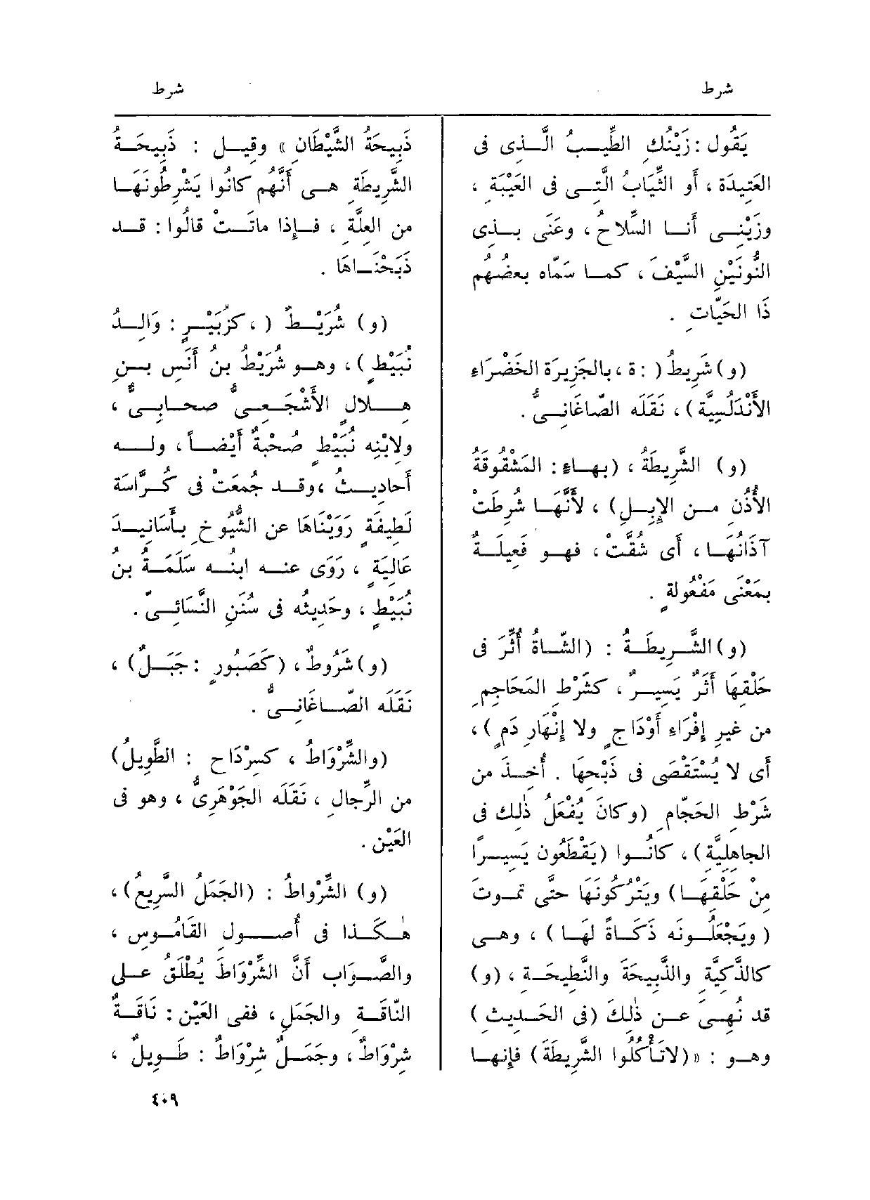 يَقُولُ: زَيْنُكِ الطِّيبُ الَّذي فِي العَتيدَةِ، أَو الثِّيابُ الَّتِي فِي العَيْبَةِ، وزَيْني أَنا السِّلاحُ، وعَنَى بذِي النُّونَيْنِ السَّيْفَ، كَمَا سمَّاه بعضُهم ذَا الحَيَّاتِ. وشَرِيطُ: ة، بالجَزيرَةِ الخَضْراءِ الأَنْدَلُسِيَّة، نَقَلَهُ الصَّاغَانِيّ. والشَّريطَةُ، بهاءٍ: المَشْقوقَةُ الأُذُنِ من الإِبِلِ، لأَنَّها شُرِطَتْ آذانُها، أَي شُقَّتْ، فَهُوَ فَعِيلَةٌ بمَعْنَى مَفْعُولَةٍ. والشَّرِيطَةُ: الشَّاةُ أُثِّرَ فِي حَلْقِها أَثَرٌ يَسيرٌ، كشَرْطِ المَحاجِمِ من غيرِ إِفْرَاءٍ وأَوْداجٍ وَلَا إِنْهَارِ دَمٍ، أَي لَا يُسْتَقْصى فِي ذَبْحِها. أُخِذَ من شَرْطِ الحَجَّامِ وكانَ يُفْعَلُ ذلِكَ فِي الجاهِلِيَّةِ، كَانُوا يَقْطَعُون يَسيراً من حَلْقِها ويَتْرُكُونَها حتَّى تموتَ ويجْعَلونَهُ ذَكاةً لَهَا، وَهِي كالذَّكِيَّةِ والذَّبيحَةِ والنَّطيحَةِ، وَقد نُهِيَ عَن ذلِكَ فِي الحديثِ وَهُوَ: لَا تأْكُلُوا الشَّرِيطَةَ فإِنَّها ذَبيحَةُ الشَّيْطانِ وقِيل: ذَبيحَةُ الشَّرِيطَةِ هِيَ أَنَّهم كَانُوا يَشْرِطونَها من العِلَّةِ، فَإِذا ماتَتْ قَالُوا: قَدْ ذَبَحْناها. وشَريطٌ، كزُبَيْرٍ: والِدُ نُبَيْطٍ، وَهُوَ شَرِيطُ بنُ أَنَسِ بنِ هِلالٍ الأَشْجَعِيّ صحابيٌّ، ولابْنِه نُبَيْطٍ صُحْبَةٌ أَيْضاً، وَله أَحاديثُ، وَقد جُمعتْ فِي كُرَّاسَة لَطيفَةٍ رَوَيْناها عَن الشُّيوخِ بأَسانيدَ عاليَةٍ، وروى عَنهُ ابنُه سَلَمَةُ بنُ نُبَيْطٍ، وحديثُه فِي سُنَنِ النَّسائيّ. وشَرُوطٌ، كصَبُورٍ: جَبَلٌ، نَقَلَهُ الصَّاغَانِيّ. والشِّرْواطُ، كسِرْداحٍ: الطَّويلُ من الرِّجالِ، نَقَلَهُ الجَوْهَرِيّ، وَهُوَ فِي العَيْن.