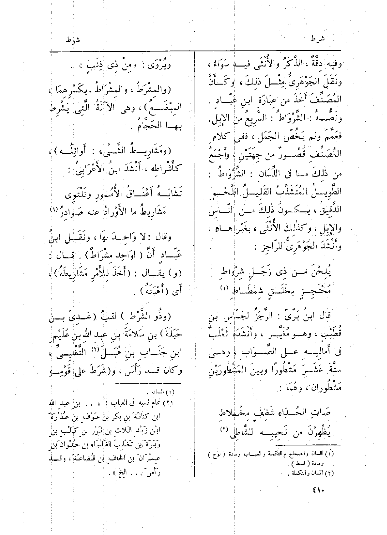 وقالَ: لَا واحِدَ لَهَا، ونَقَلَ ابنُ عَبَّادٍ أَنَّ الواحِدَ مِشْراطٌ. قالَ: ويُقَالُ: أَخَذَ للأَمْرِ مَشَارِيطَهُ، أَي أُهْبَتَهُ. وذُو الشَّرْطِ لقبُ عدِيّ ن جَبَلَةَ بنِ سَلامَةَ بنِ عَبْدِ اللهِ بنِ عُلَيْمَ ابنِ جَنابِ بنِ هُبَلَ التَّغْلِبِيِّ، وكانَ قَدْ رَأَسَ، وشَرَطَ عَلَى قومِه