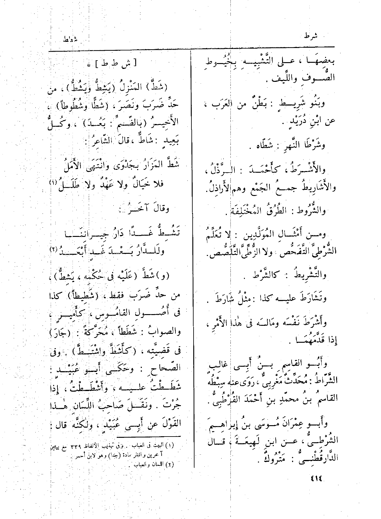 بعضِها، عَلَى التَّشبيهِ بخُيوطِ الصُّوفِ واللِّيفِ. وبَنو شَريطٍ: بَطْنٌ من العَرَب، عَن ابنِ دُرَيْدٍ. وشَرْطَا النَّهرِ: شَطَّاه. والأَشْرَطُ، كأَحْمَدَ: الرَّذْلُ، والأَشاريطُ جمعُ الجمعِ وهم الأَراذِلُ. والشُّرُوط: الطُرُقُ المُخْتَلِفَةُ. وَمن أَمثالِ المُوَلِّدين: لَا تُعَلِّمُ الشُّرْطِيَّ التَّفَحُّصَ، وَلَا الزُّطِّيَّ التَّلَصُّص.