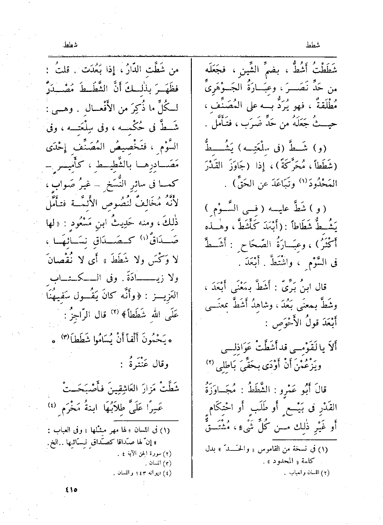 قالَ أَبُو عمرٍ و:} الشَّطَطُ: مُجاوَزَةُ القَدْرِ فِي بَيْعٍ أَو طَلَبٍ أَو احْتِكامٍ أَو غيرِ ذلِكَ من كلِّ شيءٍ، مُشْتَقٌّ من {شَطَّتِ الدَّارُ، إِذا بَعُدَت. قُلْتُ: فظهرَ بذلك أَنَّ} الشَّطَطَ مصدَرٌ لكُلِّ مَا ذُكِرَ من الأَفعالِ. وَهِي: {شَطَّ فِي حُكْمِه، وَفِي سِلْعَتِه، وَفِي السَّوْمِ، فتَخْصيصُ المُصَنِّف إِحْدَى مَصادِرِها} بالشَّطيطِ، كأَميرٍ كَمَا فِي سائرِ النُّسَخ غيرُ صَوابٍ، لأنَّهُ مُخالِفٌ لنُصوصِ الأَئِمَّةِ فتأَمَّل ذَلِك، ومِنْهُ حديثُ ابنِ مسْعودٍ: لَهَا صَدَاقٌ كصَدَاقِ نِسائِها، لَا وَكْسَ وَلَا {شَطَطَ أَي لَا نٌ صانَ وَلَا زيادَةَ. وَفِي الْكتاب العَزيز: وأَنَّه كانَ يَقُولُ سَفِيهُنا عَلَى اللهِ} شَطَطاً. قالَ الرَّاجِزُ: يَحْمُونَ أَلْفاً أَنْ يُسَامُوا شَطَطَا وقالَ عَنْتَرَةُ: