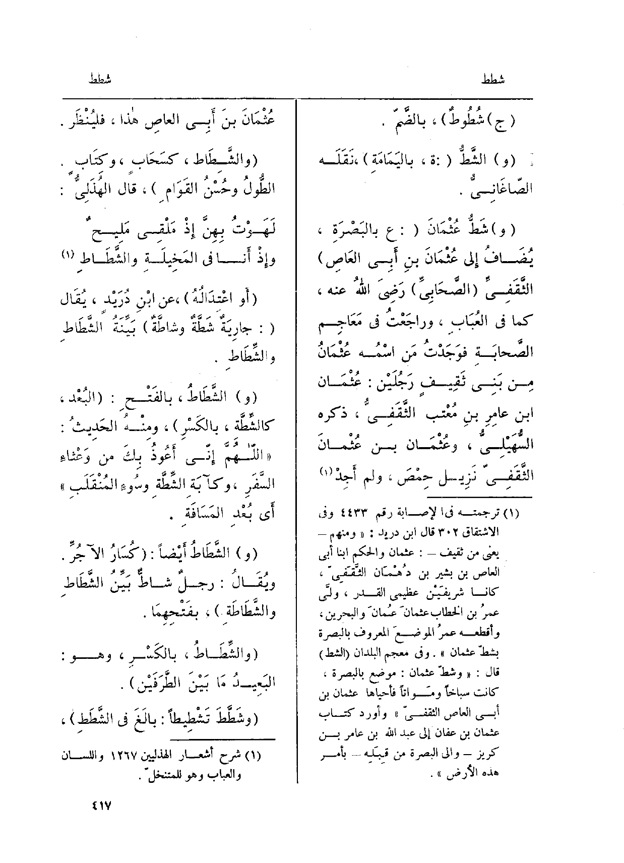 ج {شُطُوطٌ، بالضَّمِّ. والشَّطُّ: ة، باليَمَامَةِ، نَقَلَهُ الصَّاغَانِيّ. (و) } شَطُّ عُثْمانَ: ع بالبَصْرَةَ، يُضافُ إِلَى عُثْمانَ بن أَبي العاصِ الثَّقَفيِّ الصَّاحِبيِّ رَضِيَ الله عَنْه، كَمَا فِي العُبَاب، وراجَعْتُ فِي مَعاجِم الصَّحابةِ فوَجَدْتُ مَن اسْمُه عُثْمان من بَني ثَقيفٍ رَجُلَيْن: عُثْمان ابْن عَامر بن مُعْتب الثَّقَفيُّ، ذَكَرَهُ السُّهَيْلِيُّ، وعُثْمان الثَّقَفيّ نَزيل حِمْصَ، وَلم أَجِدْ عُثْمان بن أَبي الْعَاصِ هَذَا، فليُنْظر.