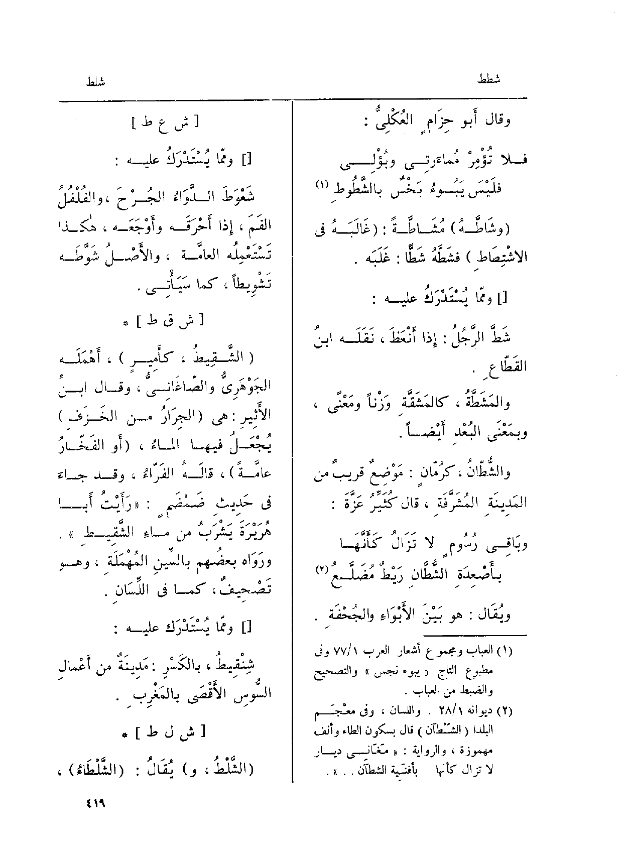 } وشَاطَّهُ {مُشَاطَّةً: غالَبَهُ فِي الاشْتِطاطِ فشَطَّهُ شَطًّا: غَلَبَه. وممَّا يُسْتَدْرَكُ عَلَيْه: شَطَّ الرَّجُلُ: إِذا أَنْعَظَ، نَقَلَهُ ابنُ القَطّاعِ.} والمَشَطَّةُ، كالمَشَقَّةِ وَزْناً ومَعْنًى، وبمَعْنَى البُعْدِ أَيْضاً. {والشُّطّانُ، كرُمّانٍ: مَوْضِعٌ قريبٌ من المَدينَةِ المُشَرَّفَةِ، قالَ كُثَيِّرُ عَزَّةَ: