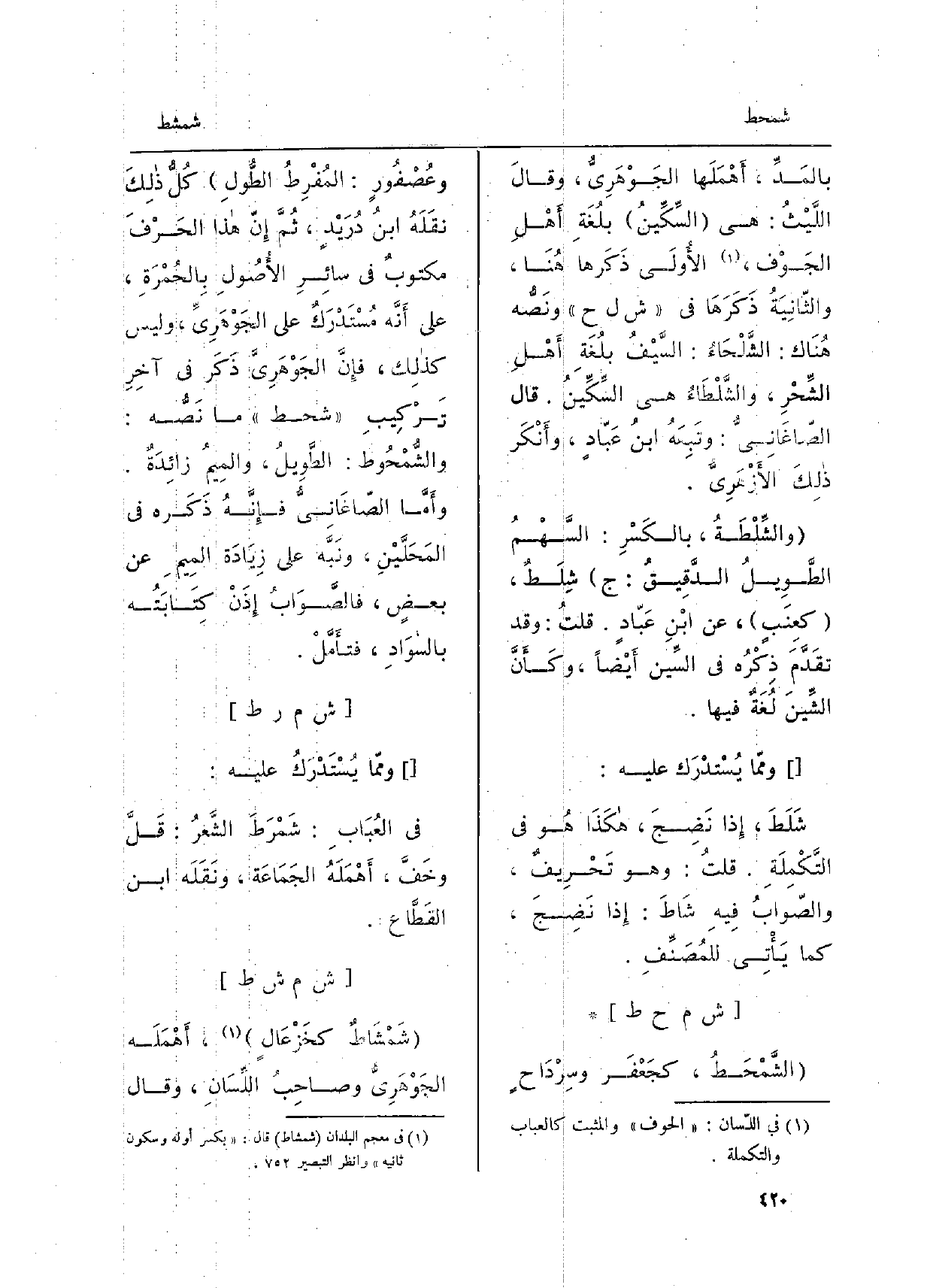 الشَّمْحَطُ، كجَعْفَر وسِرْداحٍ وعُصْفورٍ: المُفْرِطُ الطُّولِ كُلُّ ذلِكَ نَقَلَهُ ابنُ دُرَيْدٍ، ثمَّ إنَّ هَذَا الحَرْفَ مكتوبٌ فِي سائِرِ الأُصولِ بالحُمْرَةِ، عَلَى أنَّه مُسْتَدْرَكٌ عَلَى الجَوْهَرِيّ، وَلَيْسَ كَذَلِك، فإِنَّ الجَوْهَرِيّ ذَكَر فِي آخِرِ تَرْكيبِ شحط مَا نَصُّه: والشُّمْحُوط: الطَّويلُ، والميمُ زائدَةٌ. وأمَّا الصَّاغَانِيّ فإِنَّه ذَكَره فِي المَحَلَّيْنِ، ونَبَّه عَلَى زِيادَة الميمِ عَن بعضٍ، فالصَّوابُ إذَنْ كِتابَتُه بالسَّوادِ، فتأمَّل.